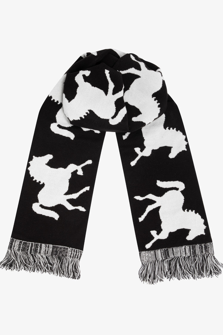 This scarf features a galloping horse silhouette on one side and a solid color on the other. Artwork by KChung Studio. • 95" Long• Made in Los Angeles, Calif.• Reversible• Unisex • 100% Acrylic