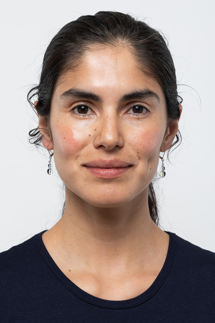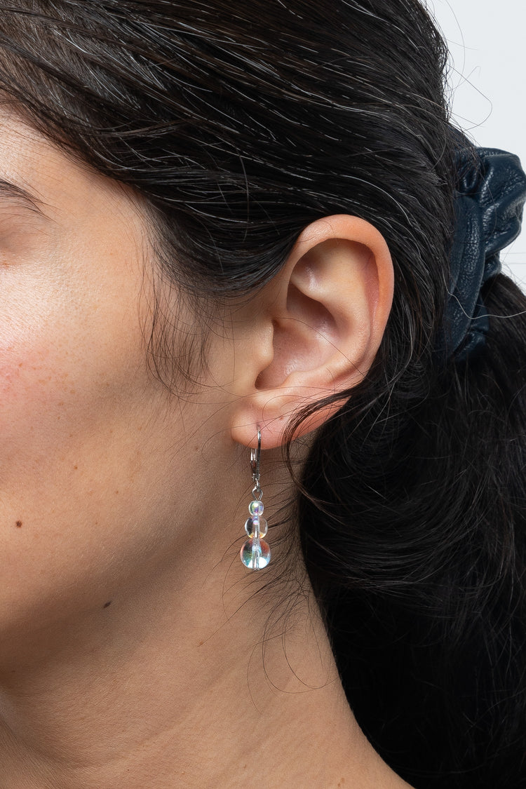 These earrings are made of clear iridescent glass beads that reflect light beautifully. Pair these with the matching glass choker (JWL6IG} for an otherworldly glow. • Glass beads• Nickel Free• Made in Los Angeles, Calif.