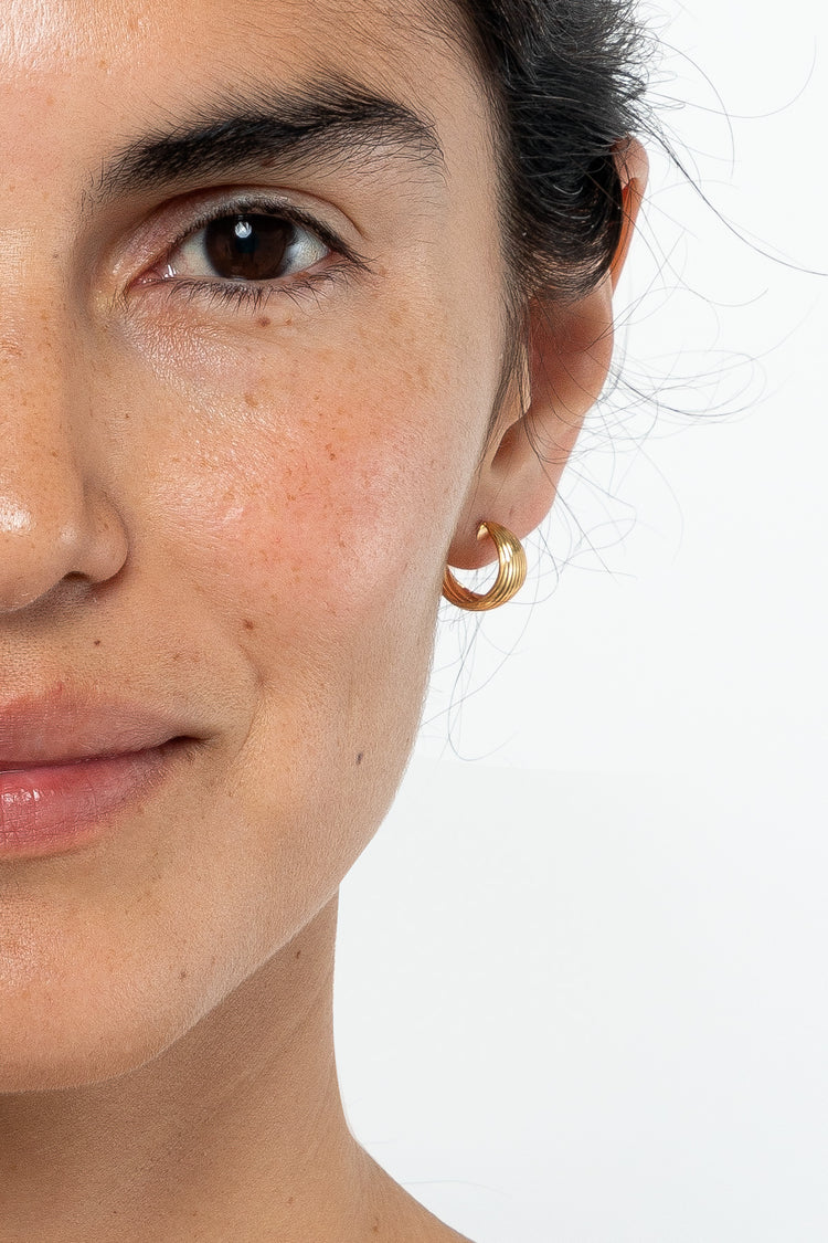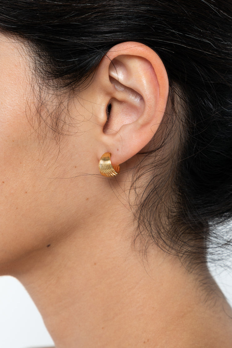 These huggies are lightweight and perfectly curve around the ear lobe. • Stainless Steel Post• Nickel Free• Brass plated in 14k Gold or Sterling Silver• Made in Los Angeles, Calif.