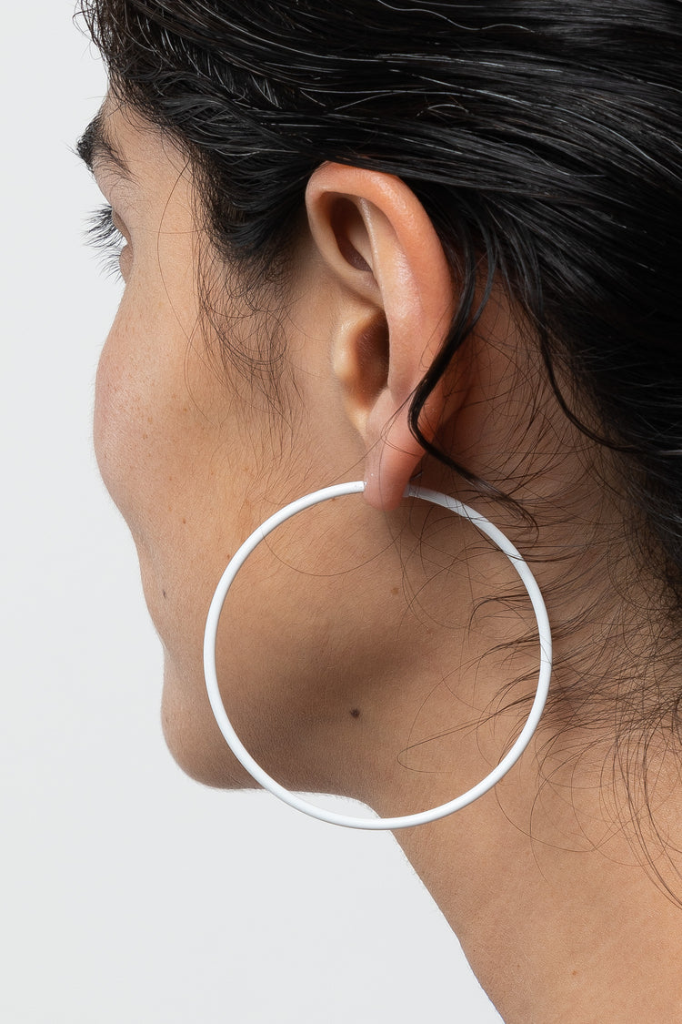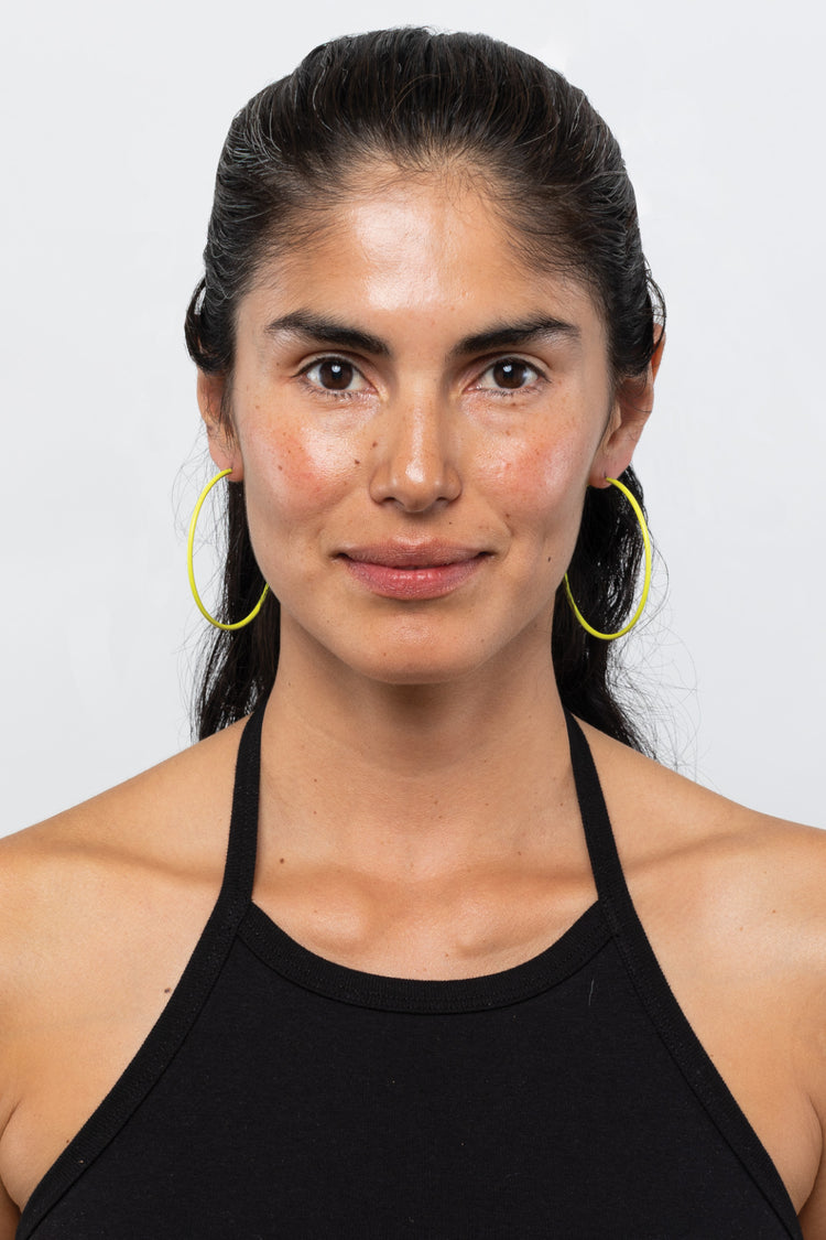 Introducing the perfect lightweight everyday timeless hoop earrings in neon yellow. These hoop earrings are sure to make you feel sexy and we promise they look incredibly flattering on all skin tones. Wear them with simple outfits that could benefit from a pop of color.Made of brass with stainless steel post sprayed wi