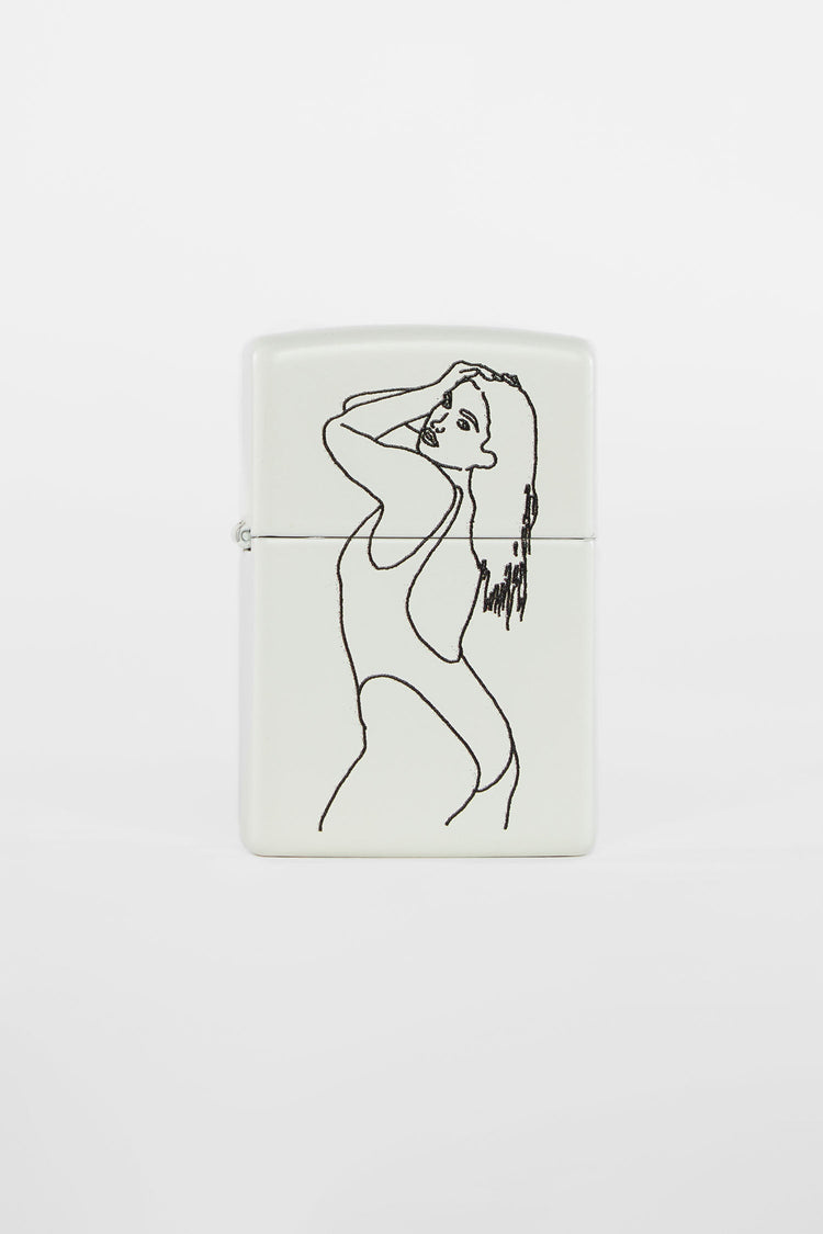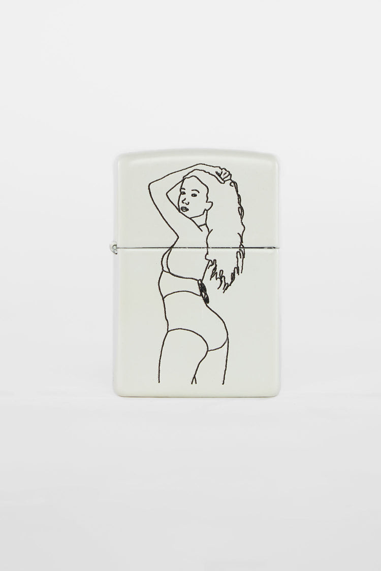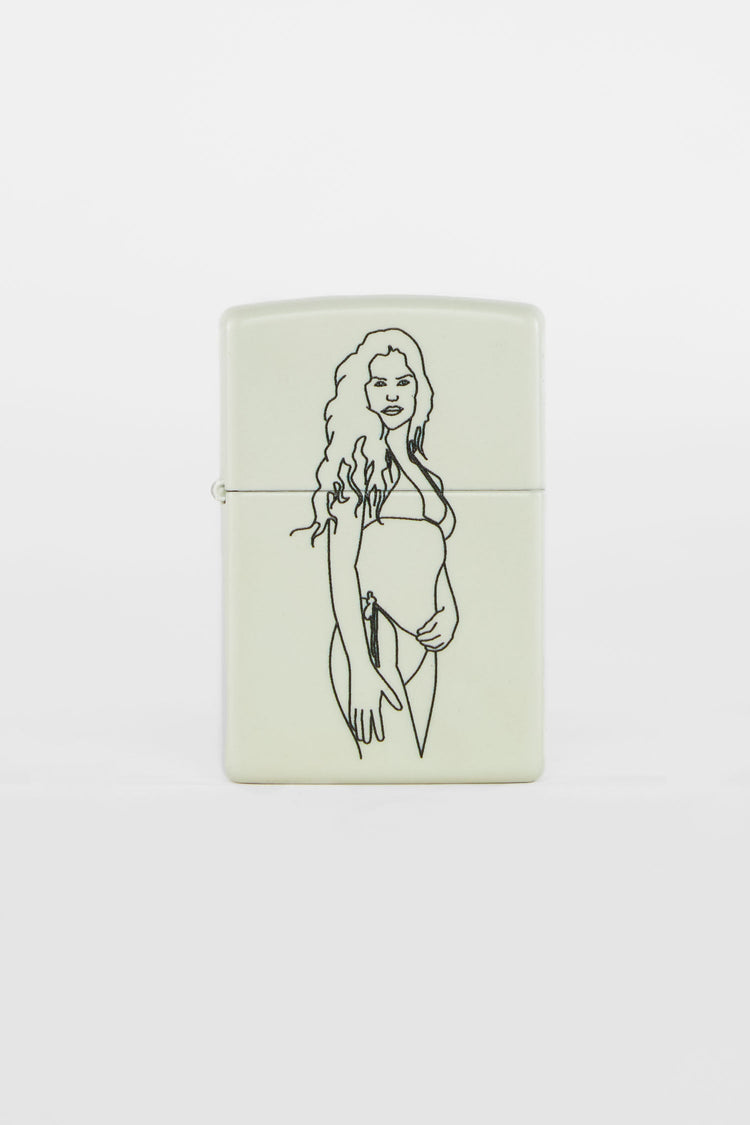 Introducing a continuous art collection of linework featuring our unique models. Line art by David Pigeon, a long time employee here at Los Angeles Apparel. All zippos are cream matte with Sofia being the only style that has a new Glow In The Dark base that brings a whole new level of creativity. Expose the lighter to