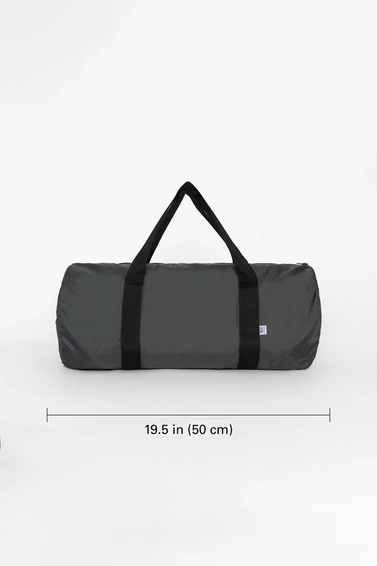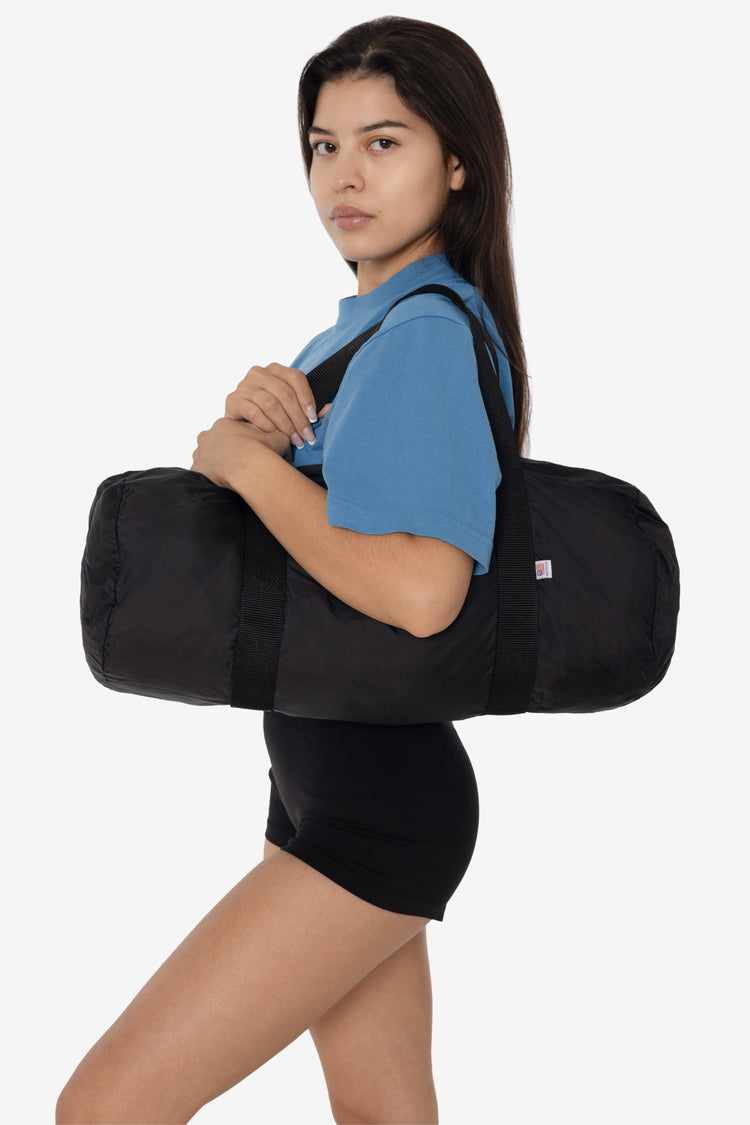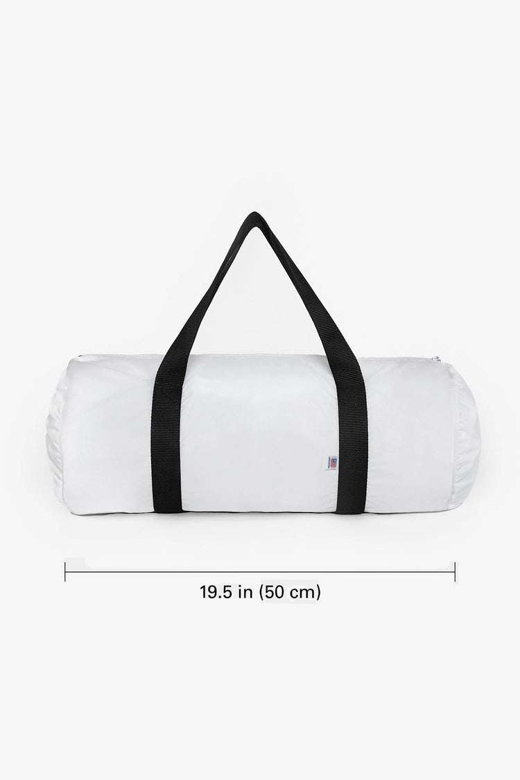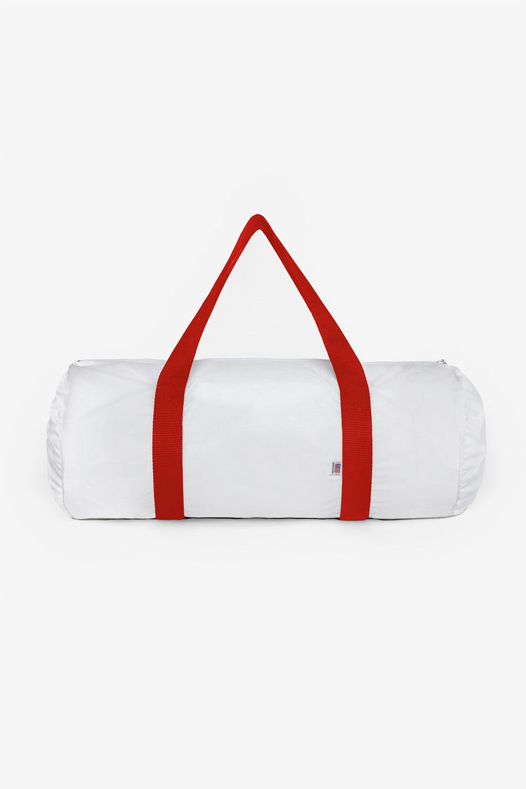 A classic gym bag made of waterproof, easy-to-clean nylon. A traditional sporty feel for the gym, traveling, or anywhere you need with durability that lasts. This bag has a height of 8.5" and bottom width of 19.5" with versatile nylon webbing straps that fit comfortable in your hand or over your shoulder. Fabric: Light
