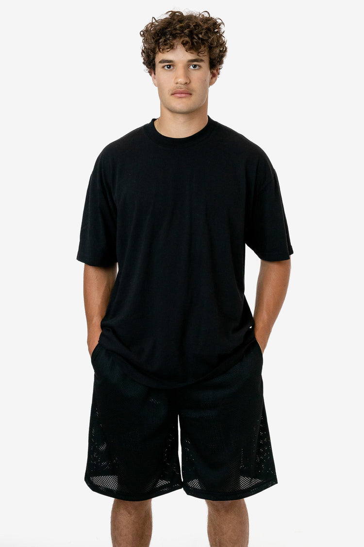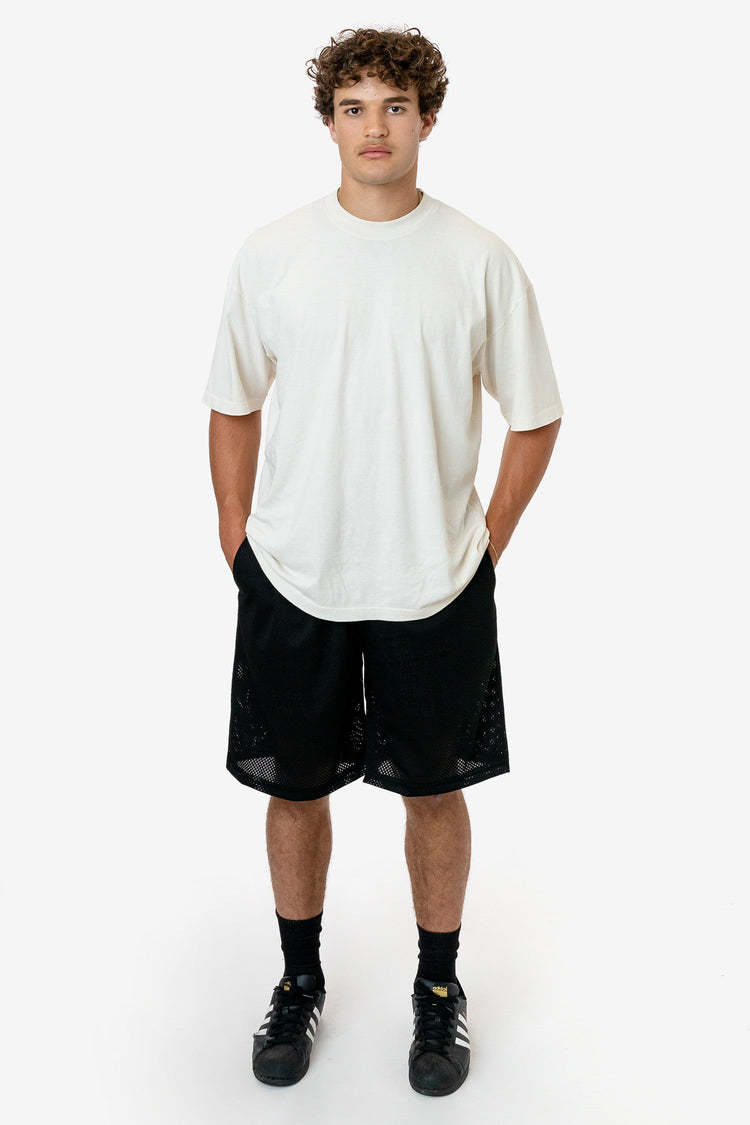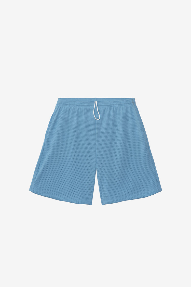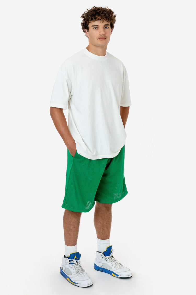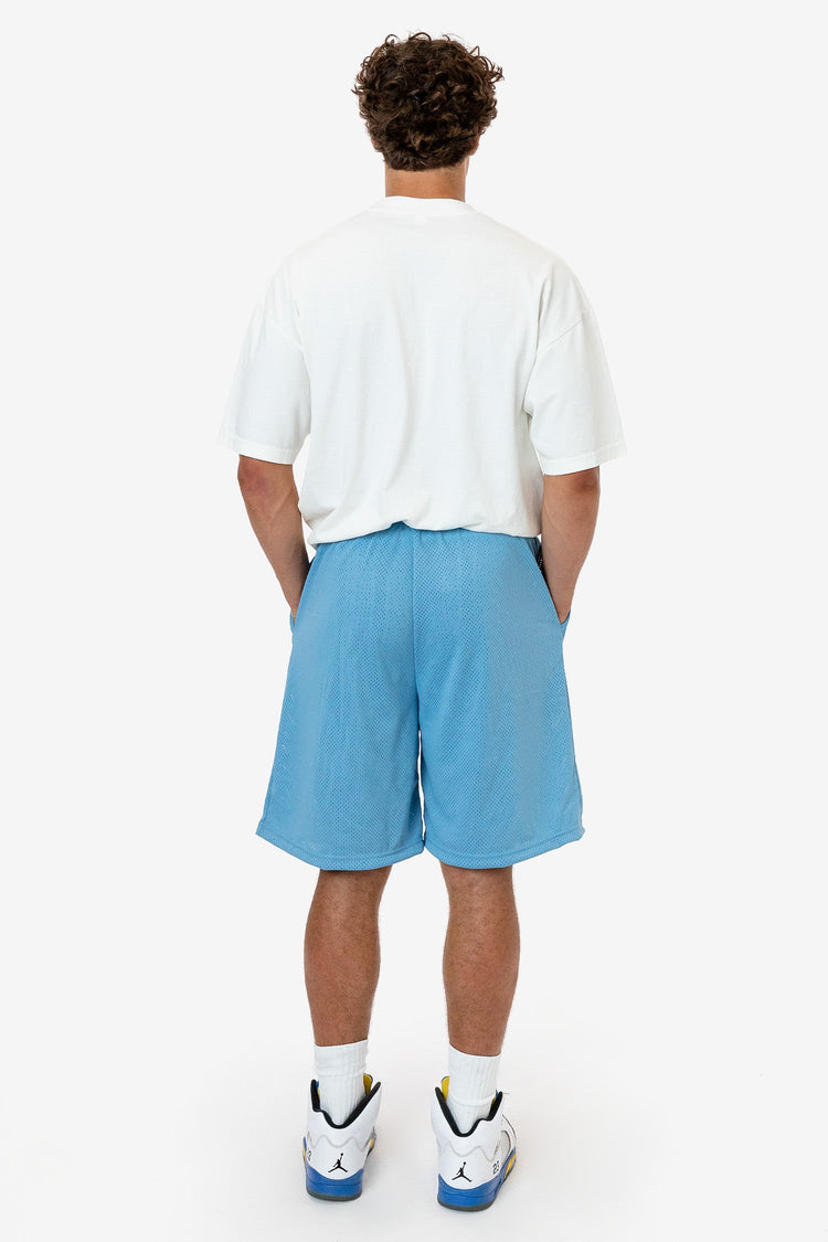 These long basketball-style shorts are made of a durable polyester mesh with a subtle translucent look. Made with an extra long inseam and generous width for a breezy fit and finished with 2 side pockets and an adjustable drawcord waist. Our experienced sewers earn up to $25 an hour and no less than $17.87; additionall