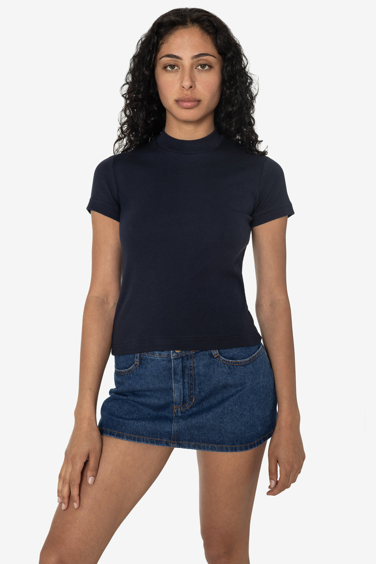In the late 90s, Dov Charney led the resurgence of the classic baby tee with his 'Classic Girl' collection of soft, fitted t-shirts for women. We've brought back the baby tee with a few updates. Our Mockneck Cap Sleeve Baby Tee has a flattering raised mockneck with a cap sleeve that is still comfortable under the arms.