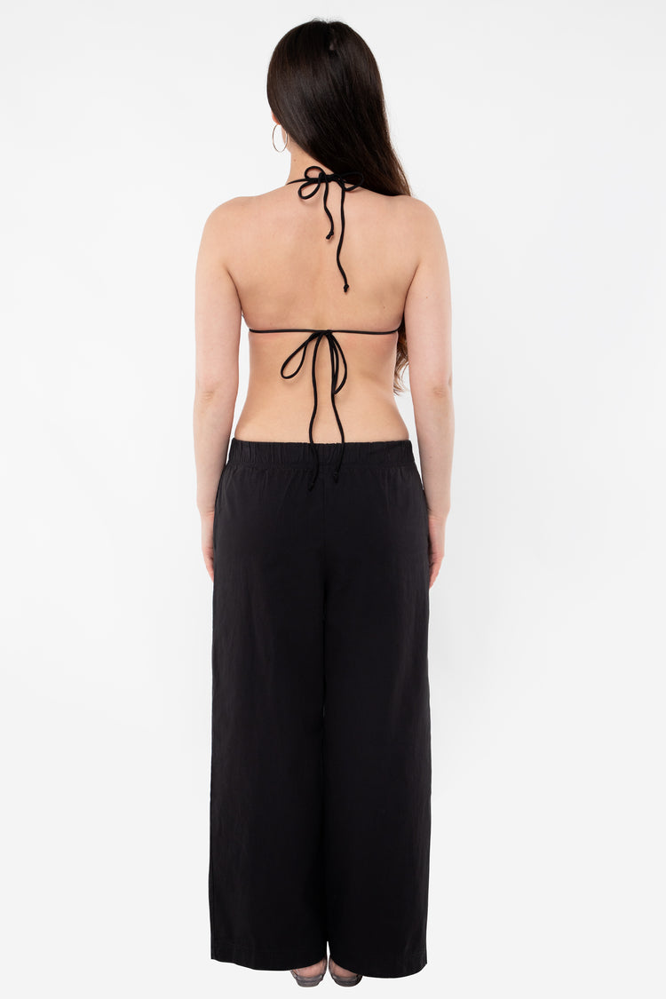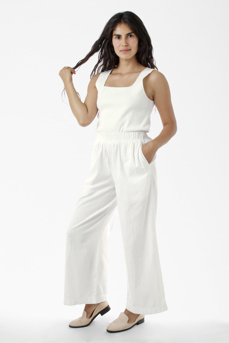 This relaxed cotton twill pant features a breezy wide leg fit and a 2 inch soft elastic waist for everyday comfort. This style can be worn for an everyday vacation look with our cotton spandex bodysuit styles or dressed up with a sweater or blouse. Comes with two side pockets. Made in Los Angeles, Calif. Our experience