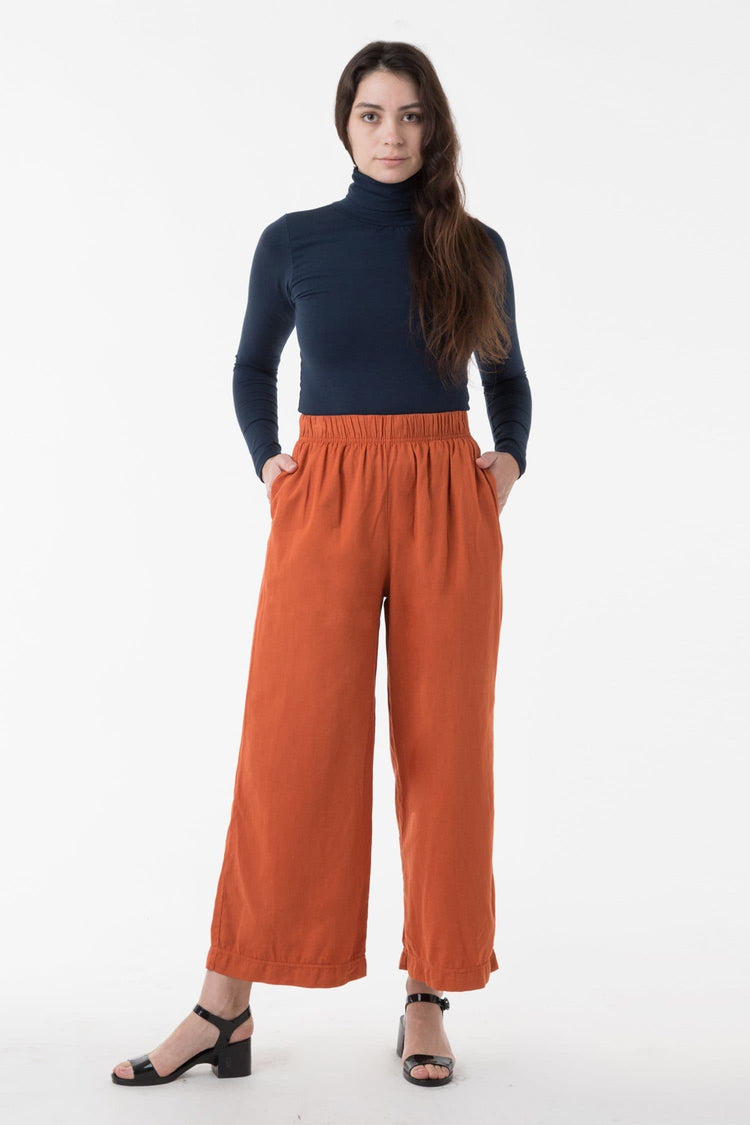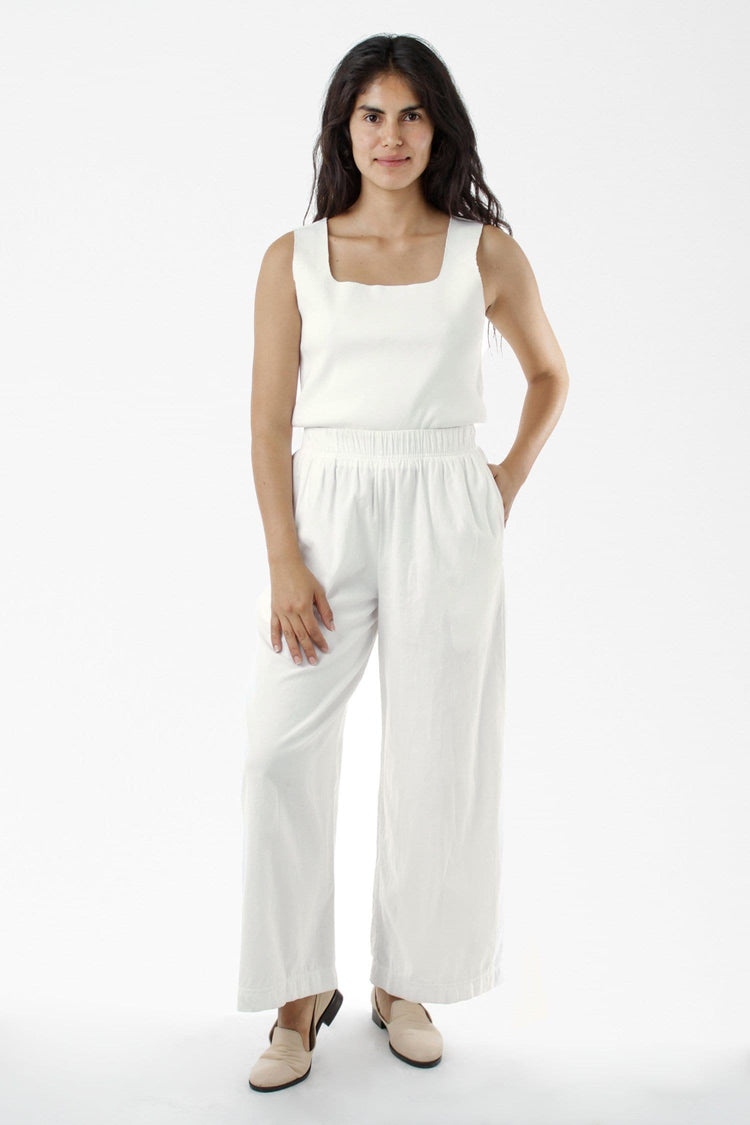 This relaxed cotton twill pant features a breezy wide leg fit and a 2 inch soft elastic waist for everyday comfort. This style can be worn for an everyday vacation look with our cotton spandex bodysuit styles or dressed up with a sweater or blouse. Comes with two side pockets. Made in Los Angeles, Calif. Our experience