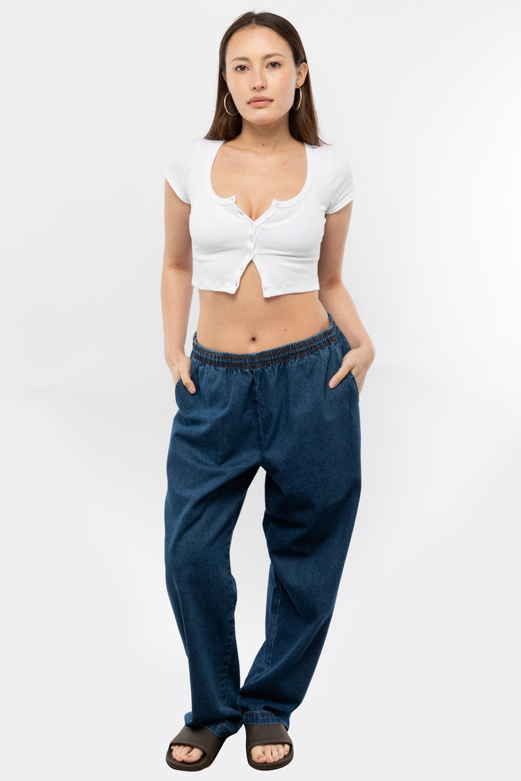 These Unisex denim pants are made of 100% US grown cotton and feature an extra wide, baggy straight leg fit. They feature 2 side pockets, 1 back pocket, and an elastic waistband with drawcord. These pants are unlined, making them super compact for for traveling and versatile for different climates and weather needs. Ou