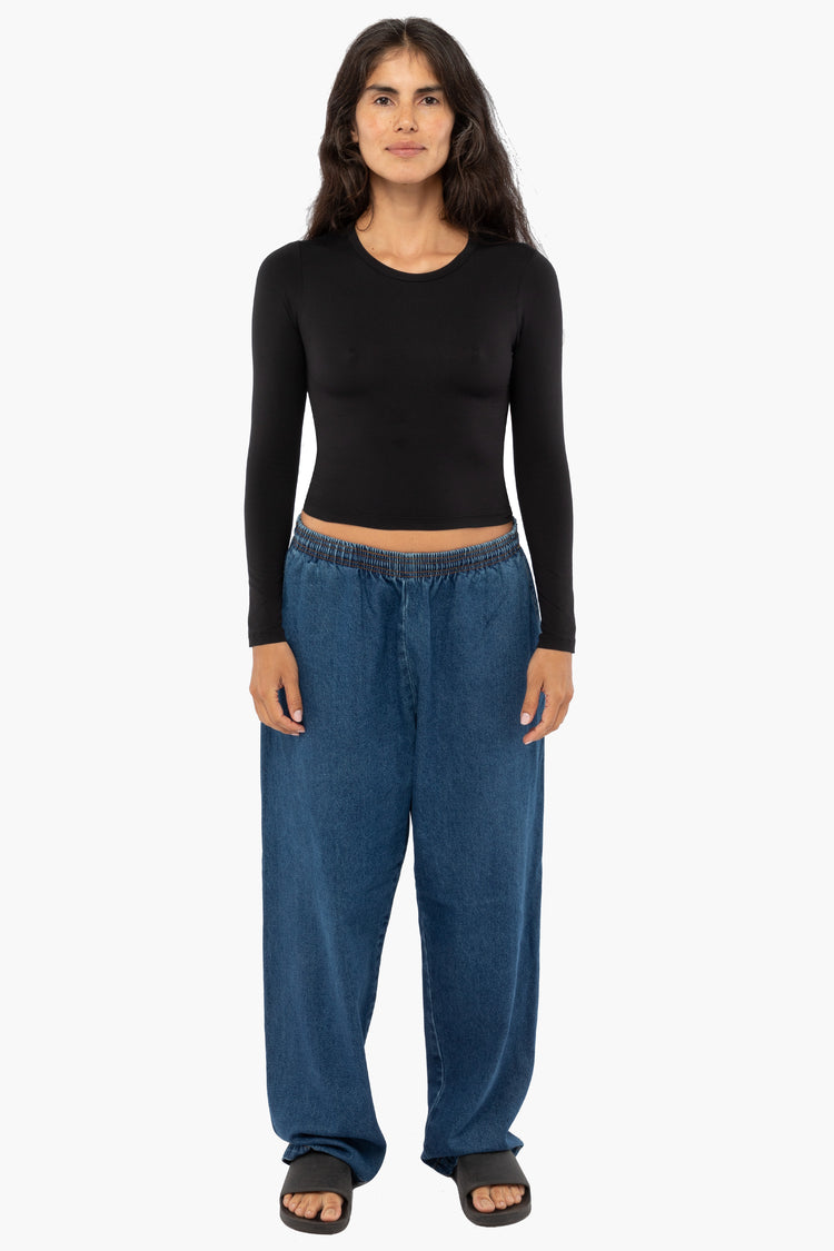 These Unisex denim pants are made of 100% US grown cotton and feature an extra wide, baggy straight leg fit. They feature 2 side pockets, 1 back pocket, and an elastic waistband with drawcord. These pants are unlined, making them super compact for for traveling and versatile for different climates and weather needs. Ou