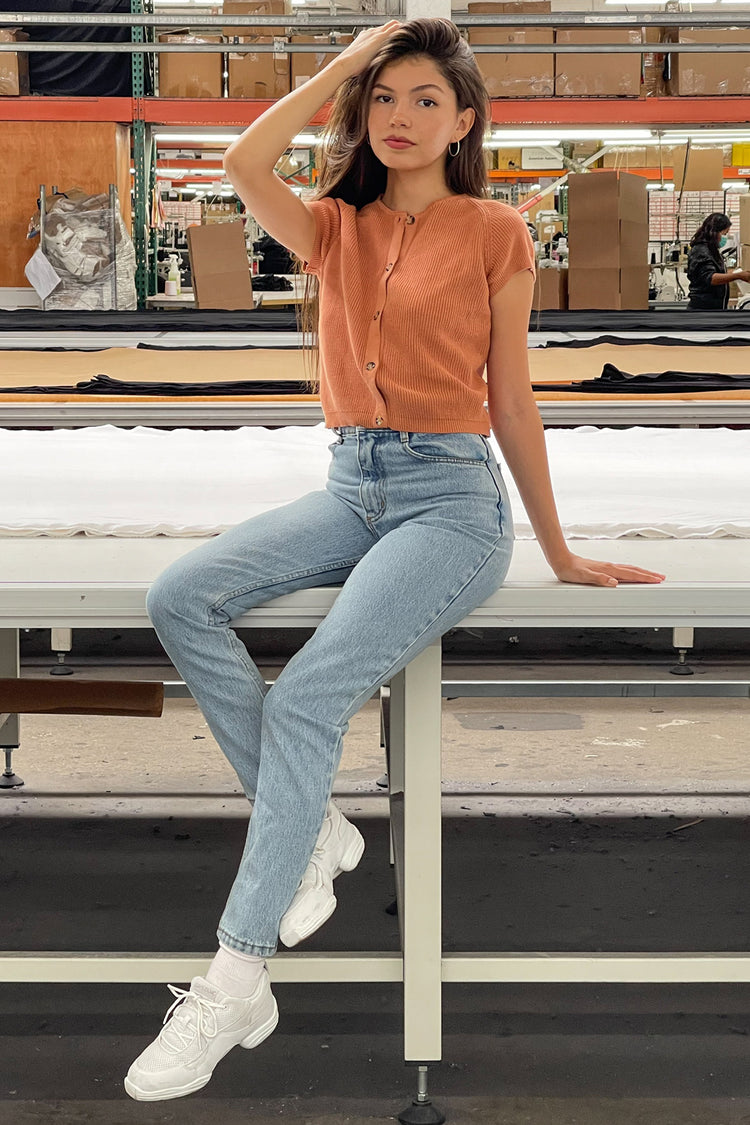 We've taken the usually sporty shape of the raglan sleeve and elevated it. This sweater ends a bit past the belly button so you can wear it tucked in or out and can be layered as a cardigan or worn on its own. Try it with our Baby Rib tees and tanks or jeans for a classic look or go flirty with it more unbuttoned to sh