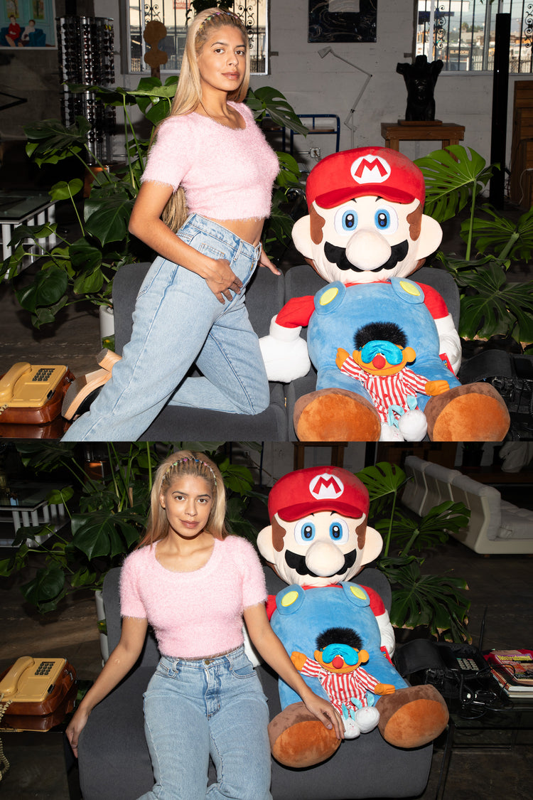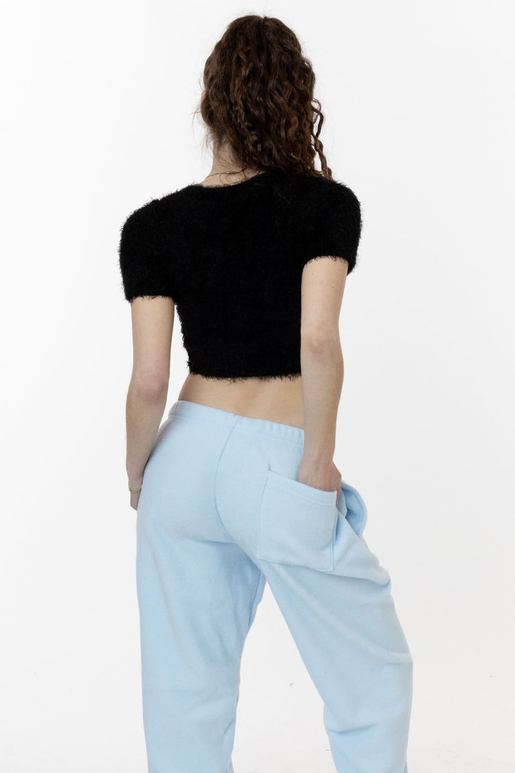 The fuzzy sweater is back just the way you remember it. This short sleeve sweater features a scoop neckline and cropped fit. Pairs perfectly with our 8385GD Garment Dye Mini Skirt for a girly look or update this style by pairing it with sweatpants for a relaxed look. This premium knit garment is knit in the U.S.A. by w