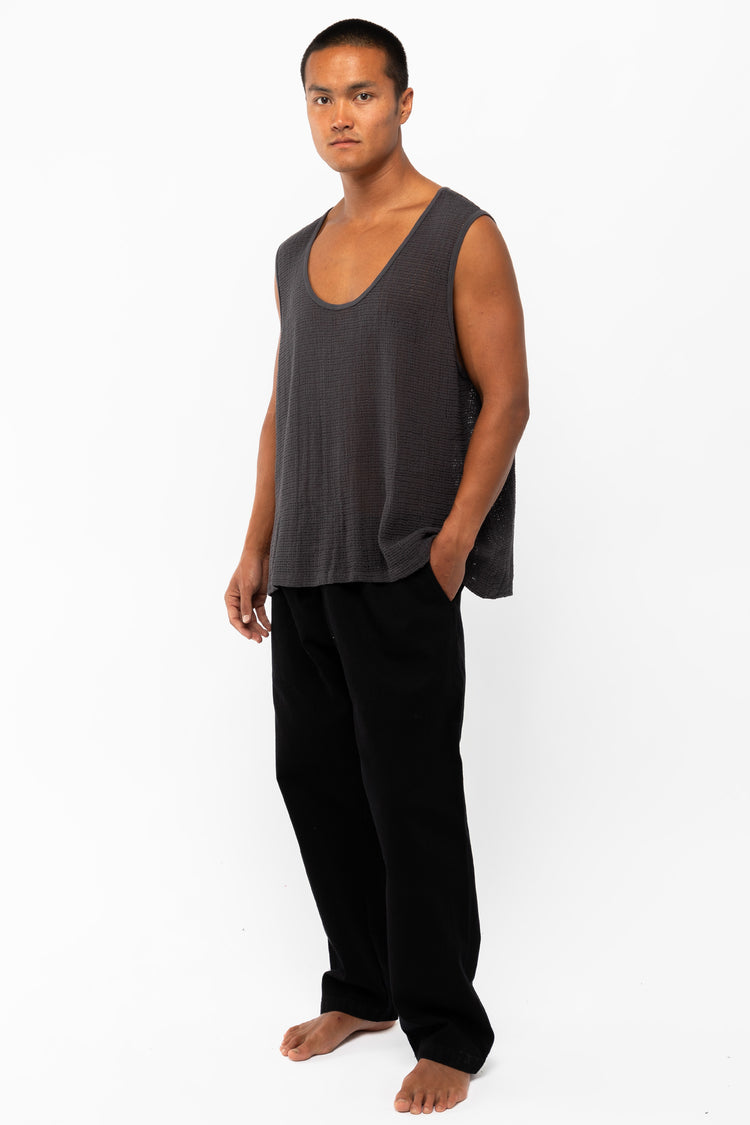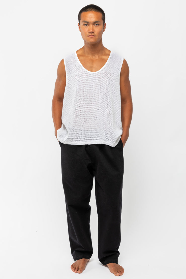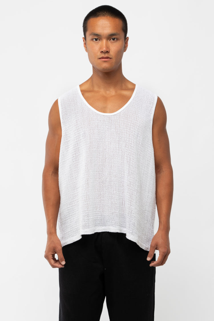 The Unisex Cotton Fishnet Tank Top has a slightly oversized fit, making it an easy option for the hottest summer days. Made in Los Angeles, Calif. Our experienced sewers earn up to $25 an hour and no less than $17.87; additionally workers have healthcare benefits for less than $15 per week, a 401k plan, paid sick days,