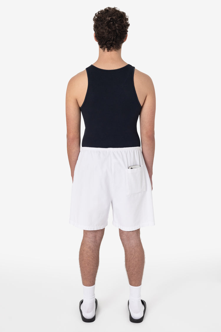 Our micro canvas mid-length shorts have a roomy, wide leg and a unisex fit. These shorts have 2 side pockets, one back pocket and an adjustable drawcord inside the elastic waistband. Runs true to size. Women may wish to size down. Whether you're lounging or ready to hit the gym, these shorts are built for any occasion.