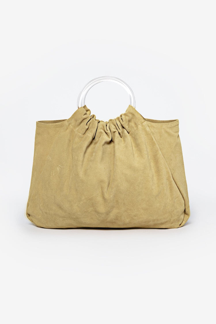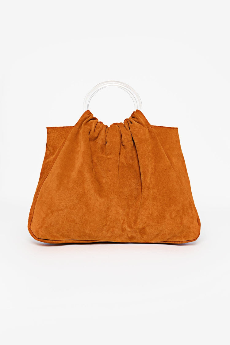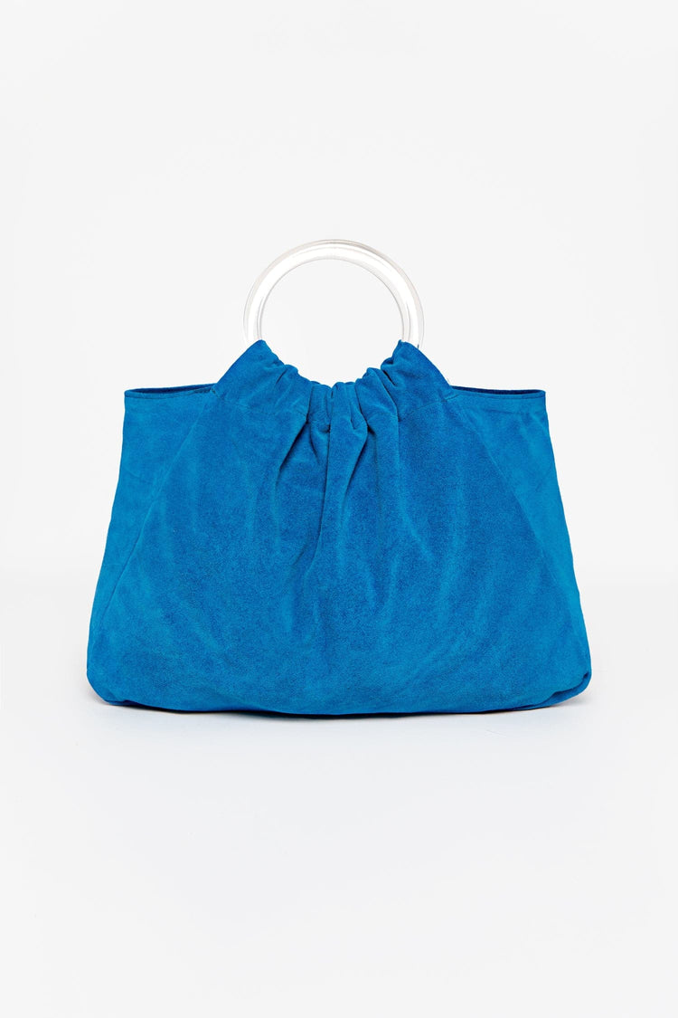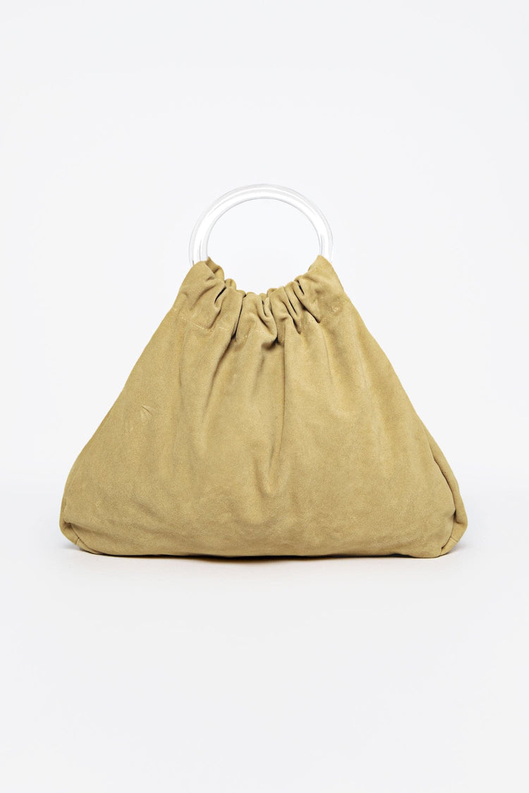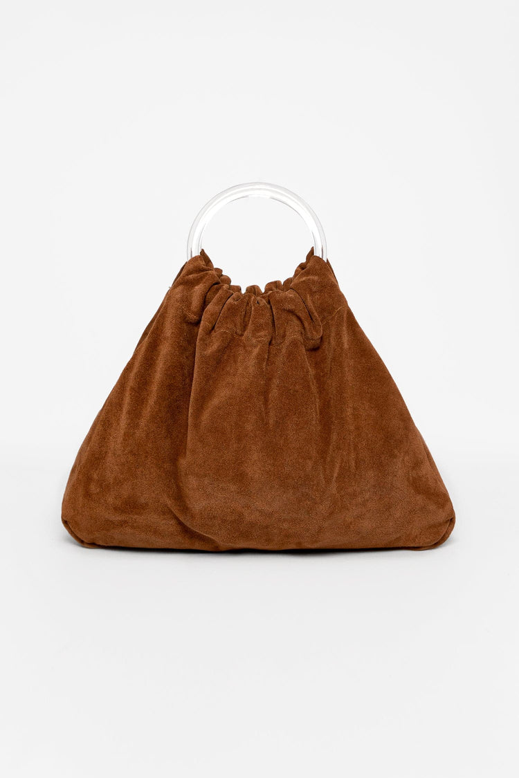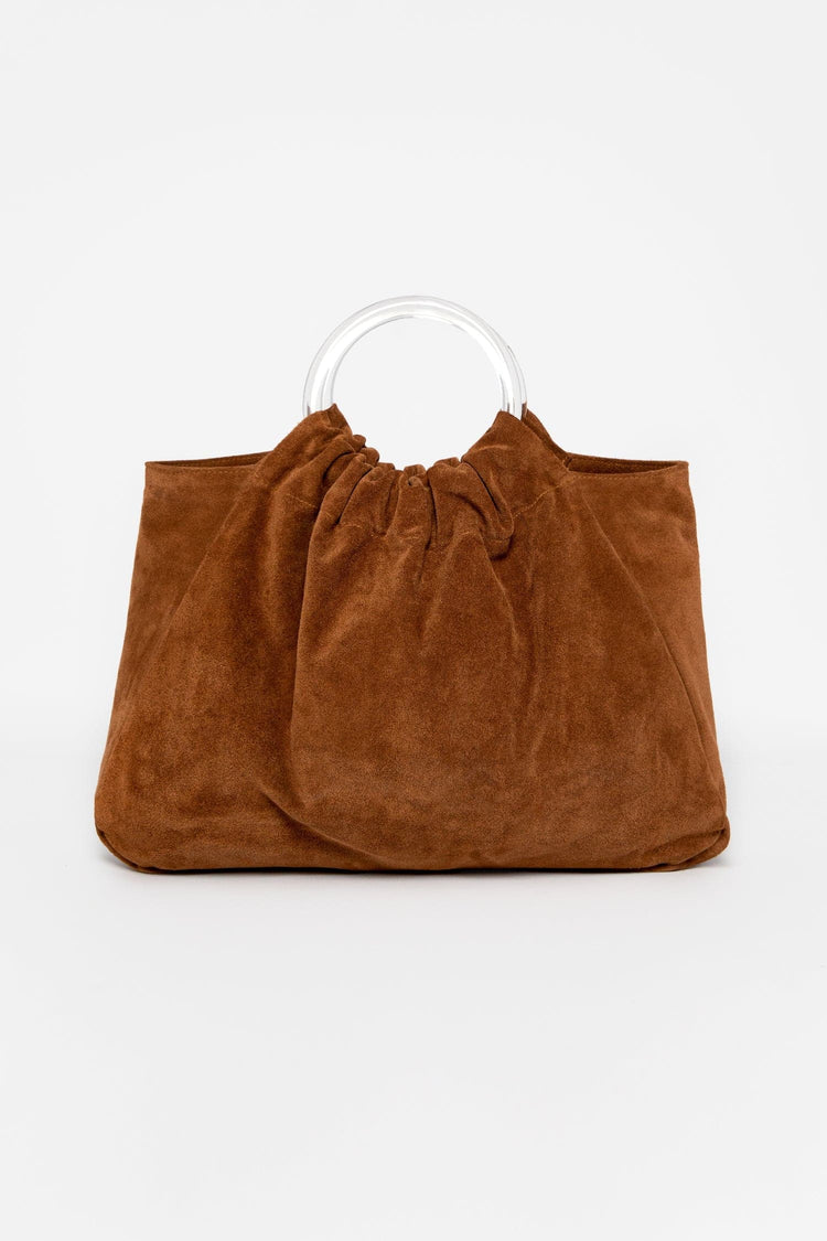 Our Acrylic Ring Bag is made from calf suede that has a soft-hand texture and exceptional durability. Our custom acrylic handle adds a modern playful touch. This bag can be used with the sides tucked in or out and is a generous size to hold all of your essentials. The acrylic ring handle can be held by hand or at the e