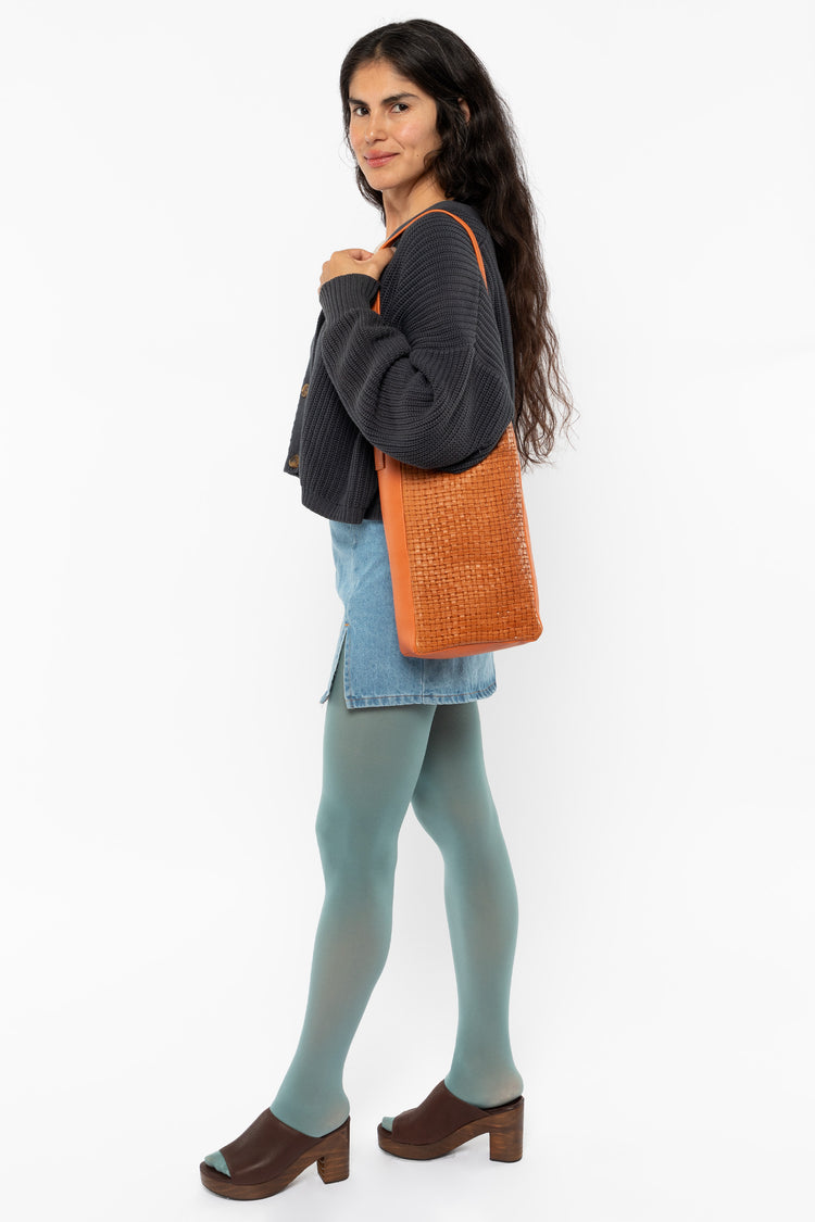 The Woven Slim Tote features a classic woven embossed pattern and easily fits your tablet, water bottle, and other essentials. This artisanal product is made of genuine leather. All scars are characteristics of the skin and not imperfections. We hope you enjoy this unique handmade object. • Lined • Made in Los Angeles,