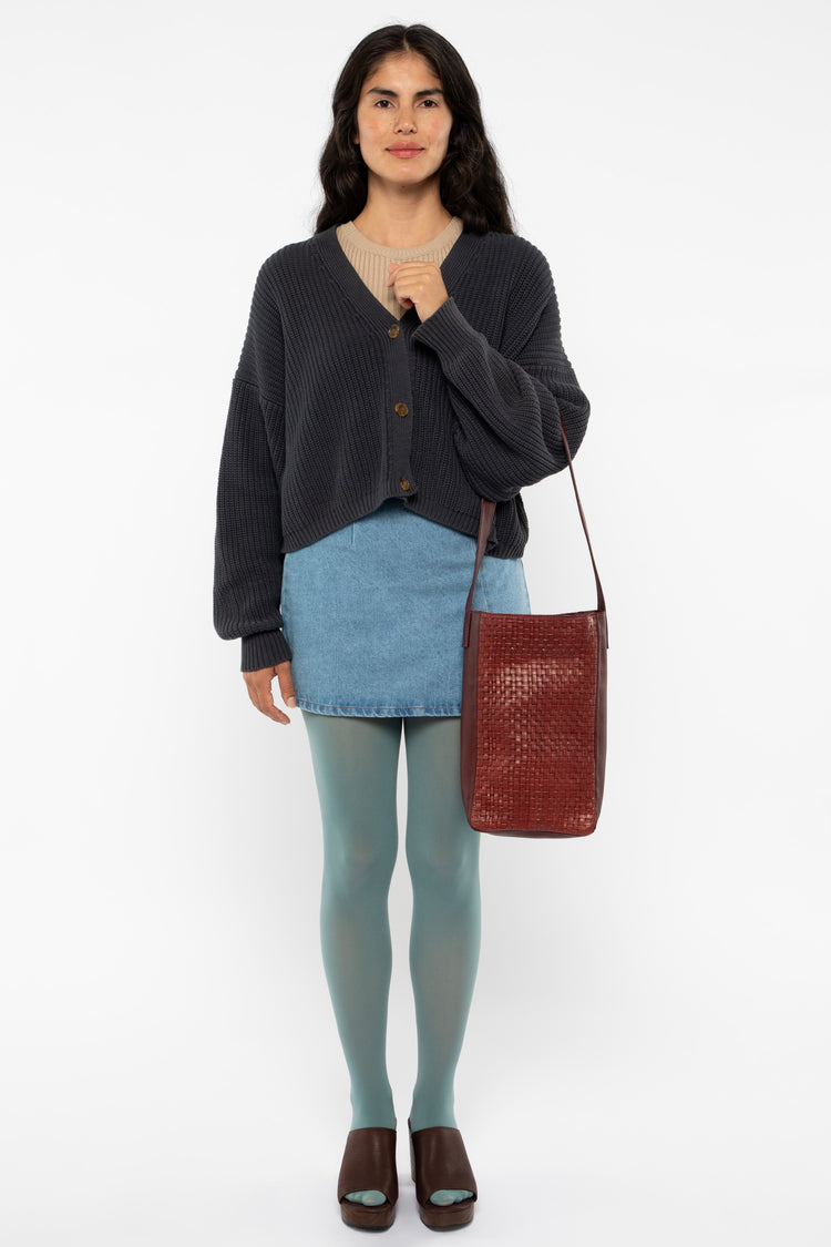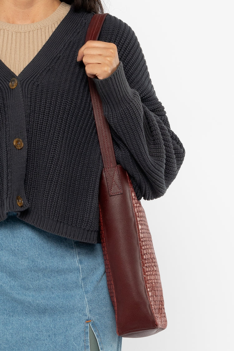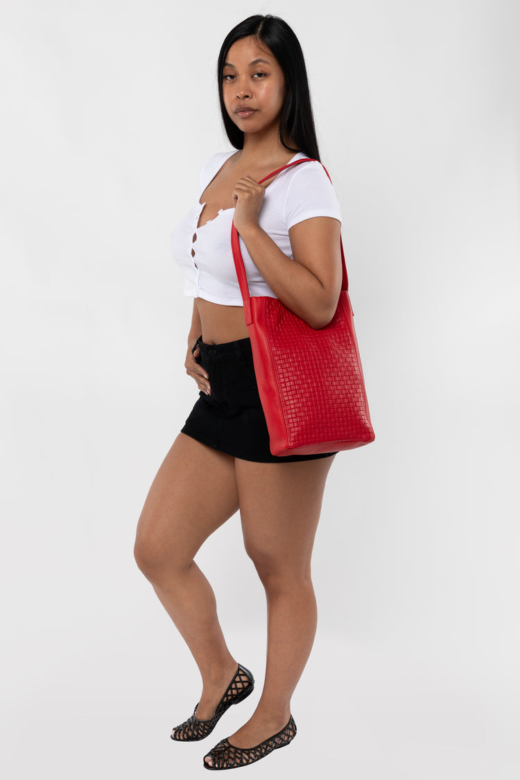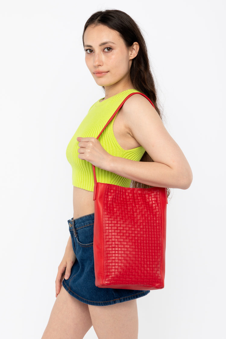 The Woven Slim Tote features a classic woven embossed pattern and easily fits your tablet, water bottle, and other essentials. This artisanal product is made of genuine leather. All scars are characteristics of the skin and not imperfections. We hope you enjoy this unique handmade object. • Lined • Made in Los Angeles,