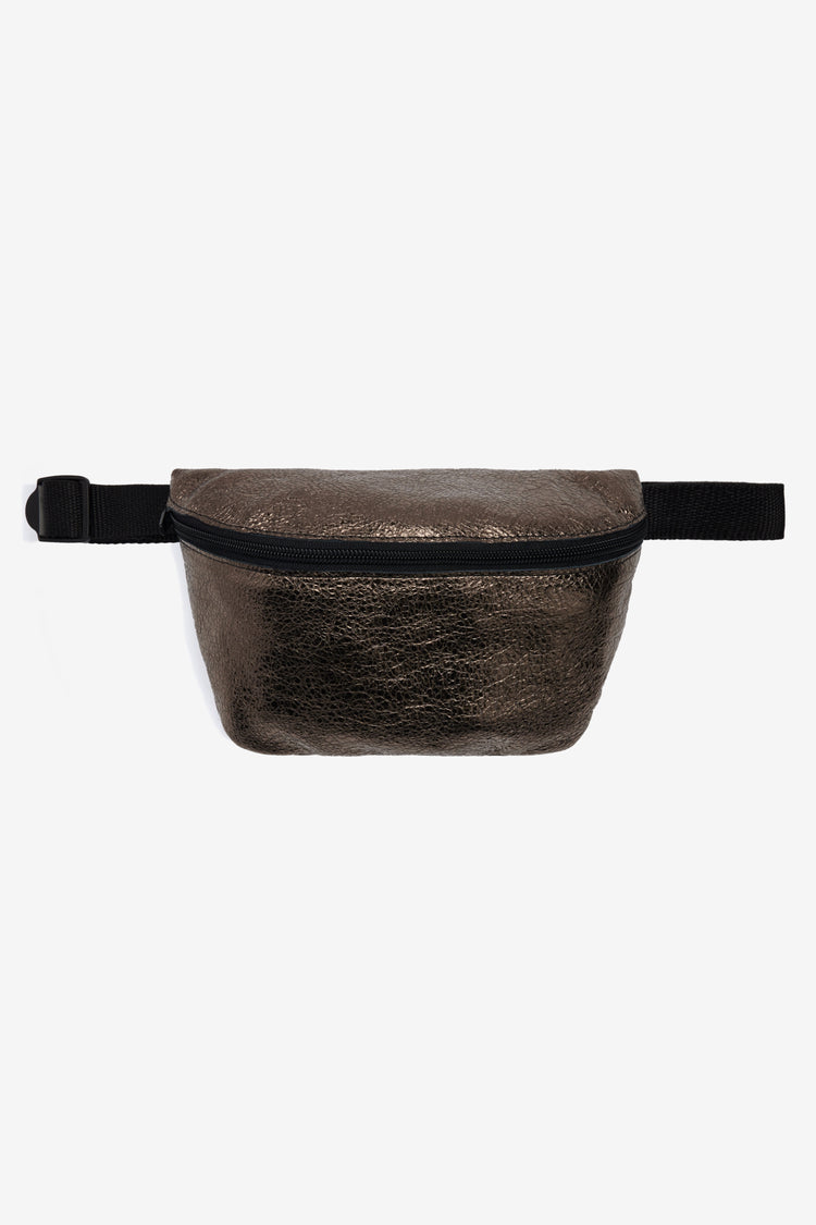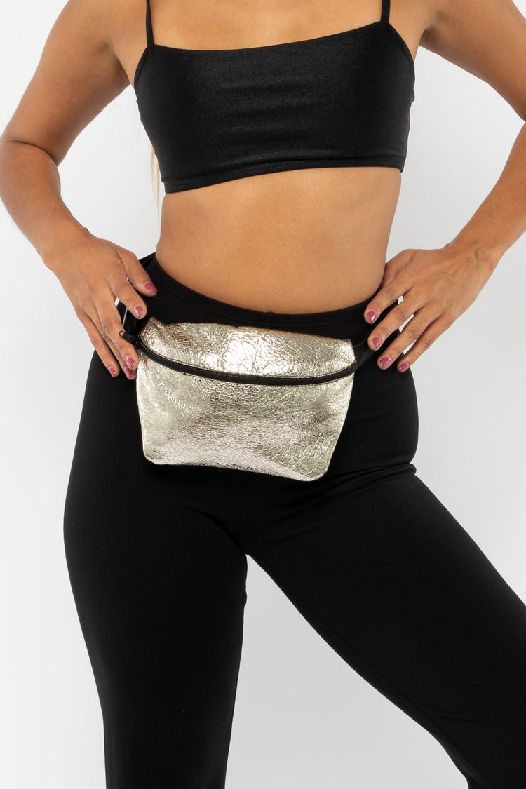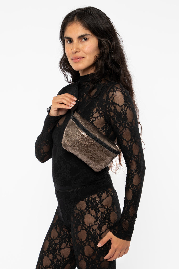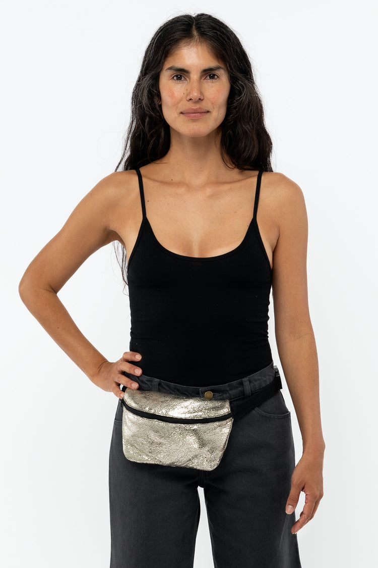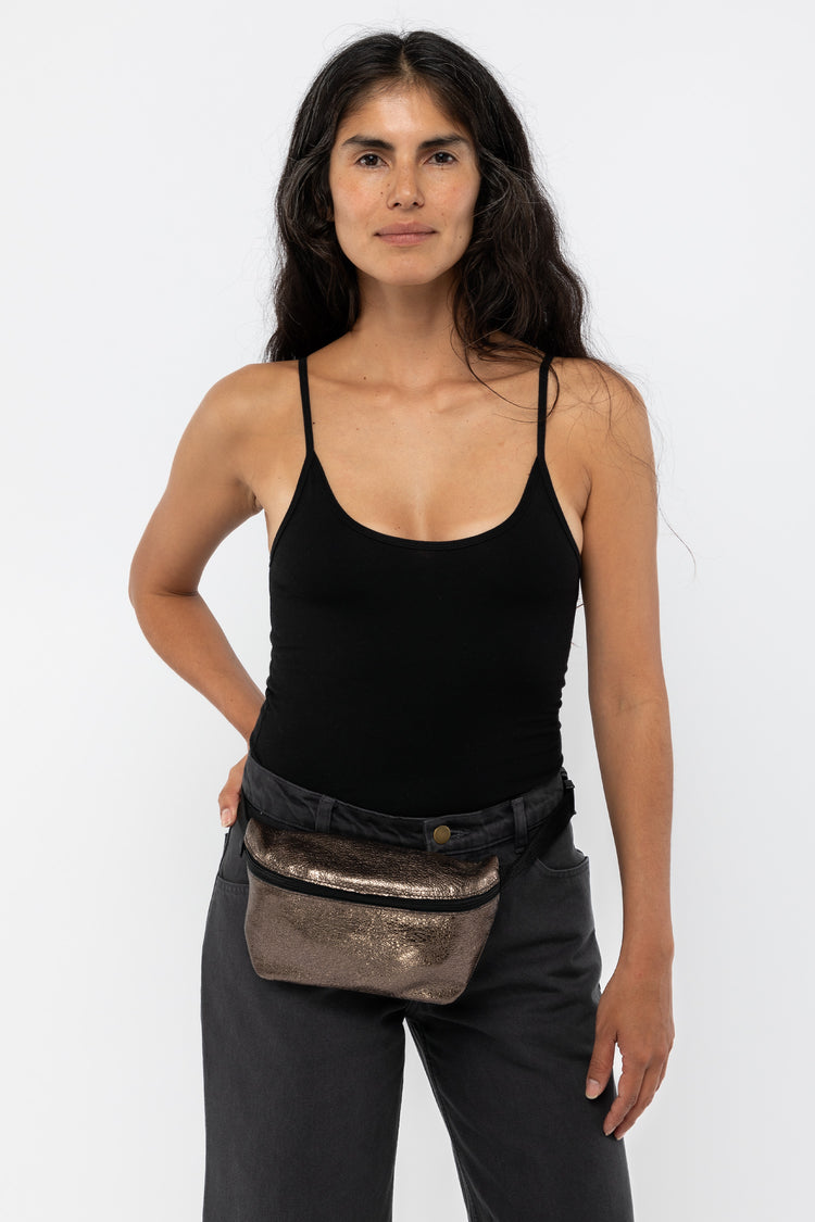Our Unisex Leather Fanny Pack features a streamlined minimalist design that can be worn in a variety of ways, including low on the hips or slung across the chest as a crossbody bag. Black and Bark are cowhide. Light Gold, Pewter, and Silver are sheep skin. This artisanal product is made of genuine leather. All scars ar