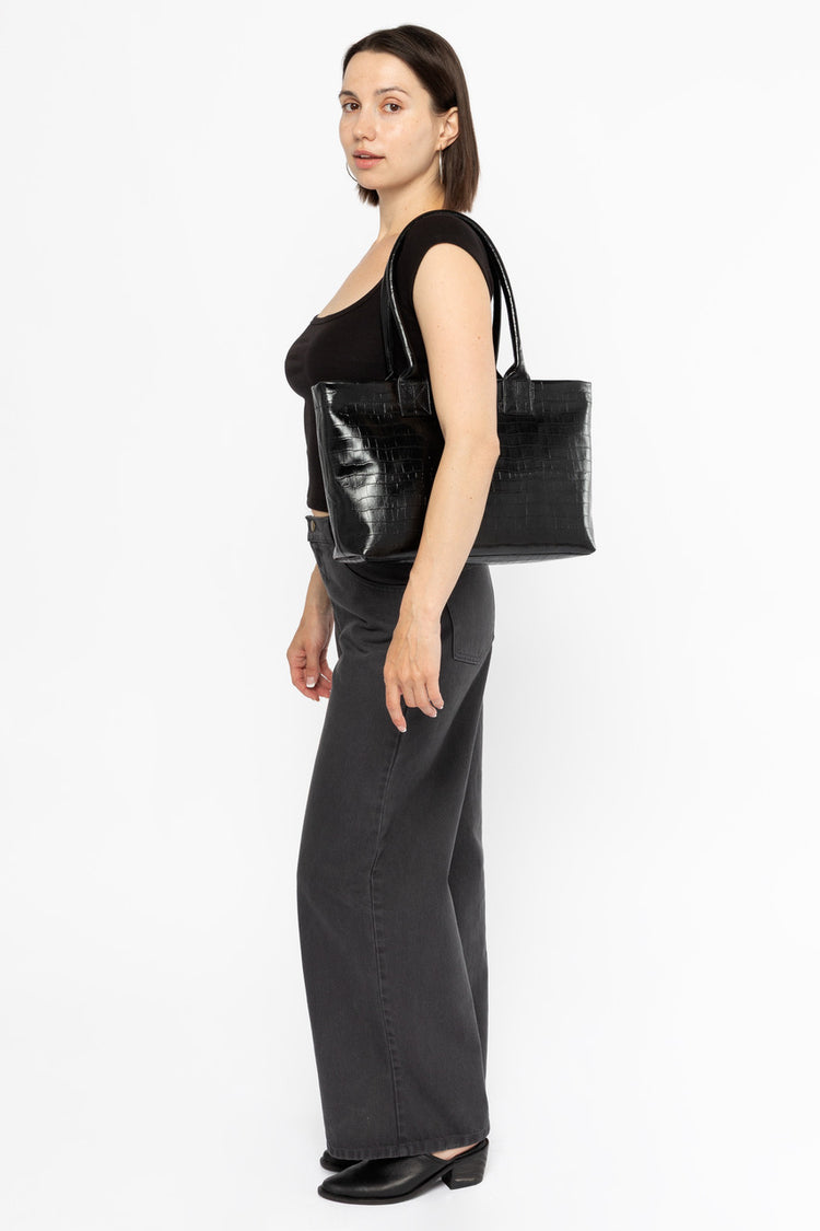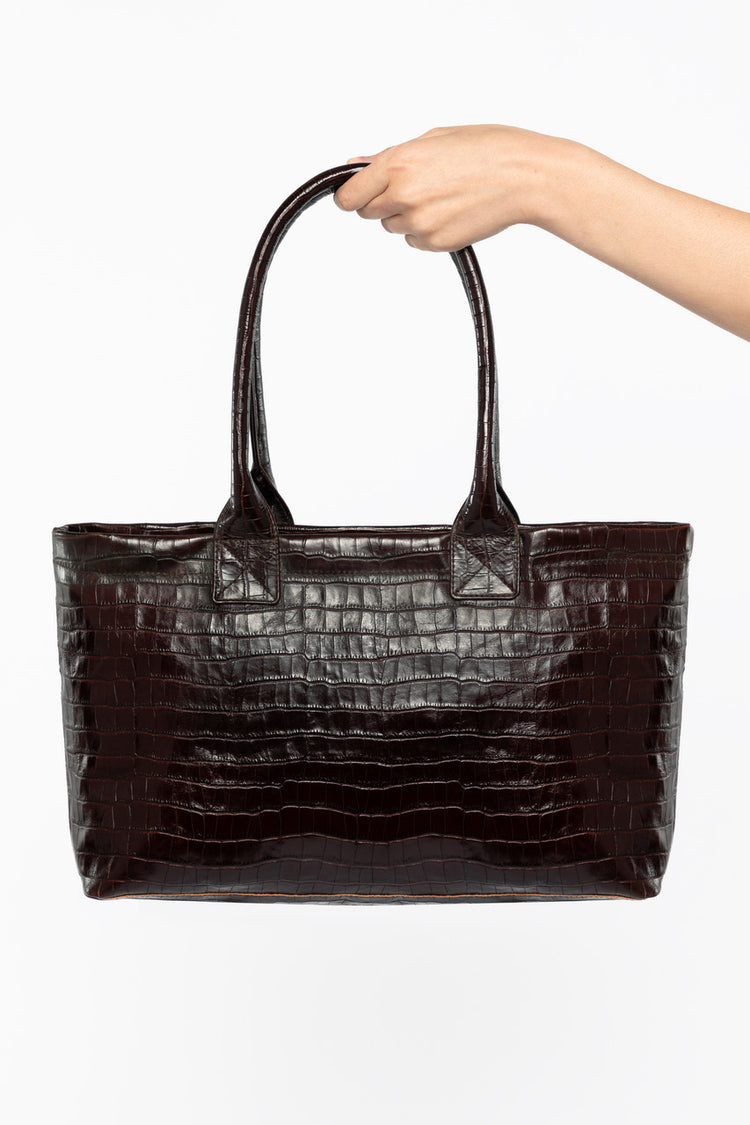 The Crocodile Weekday Tote Bag is a work bag that combines function and polish. It’ll work with you from day to night, as you grab the sturdy luggage handles on the way to catch the train or meander through city streets with friends in search of after hours drinks. The cowhide shell is embossed with a crocodile texture