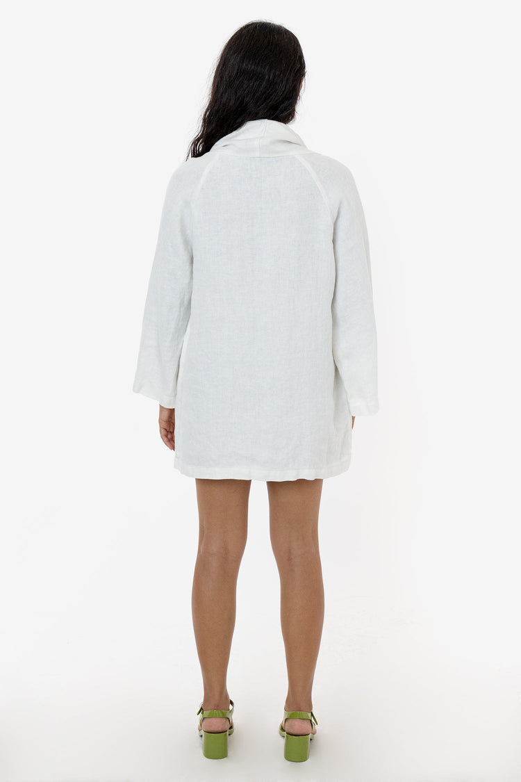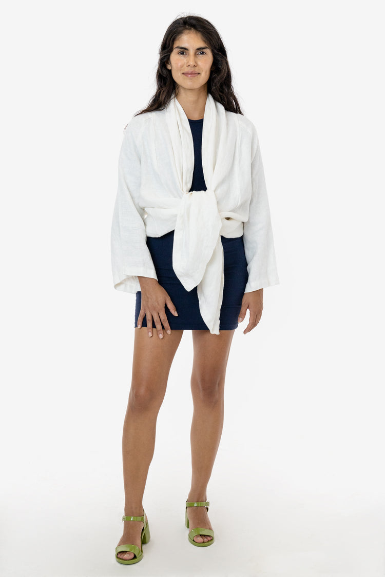 This heavy-weight front tie cardigan is made of 100% Linen Burlap. Woven from the flax plant is a strong and flexible fabric;It only gets softer with wear. This item is a garment dyed to remain shrink-free and fade-resistant for years to come. Made in Los Angeles, Calif. Our experienced sewers earn up to $25 an hour an