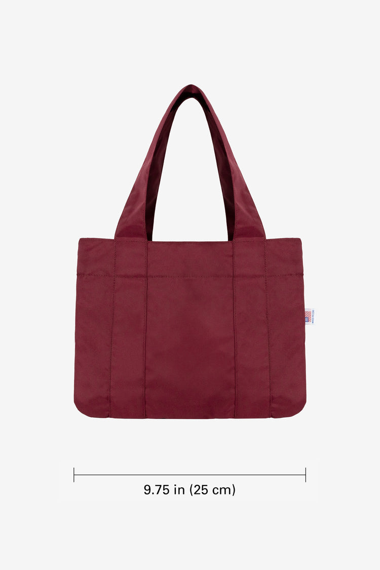 This mini tote bag is made of our nylon pack cloth and features a contrasting nylon lining and a handy internal pocket. Easily keep this bag clean by wiping it down with a wet cloth or machine washing. Our durable Nylon will keep your belongings safe and contrasting liner makes this pouch fun to use. Made in South Cent