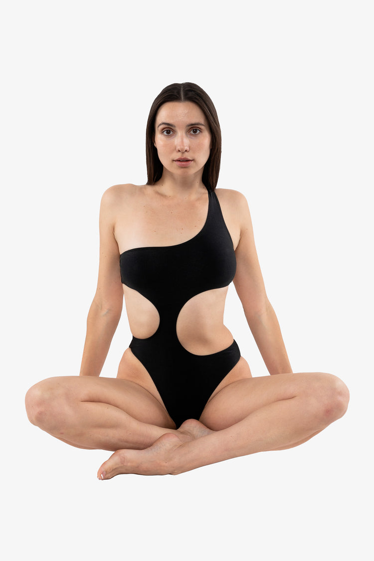 Sporty and chic, the Asymmetrical One Piece adds Surrealist flair to your summer wardrobe. Fits true to size. We recommend sizing up for length. Made in Los Angeles, Calif. Our experienced sewers earn up to $25 an hour and no less than $17.87; additionally workers have healthcare benefits for less than $15 per week, a