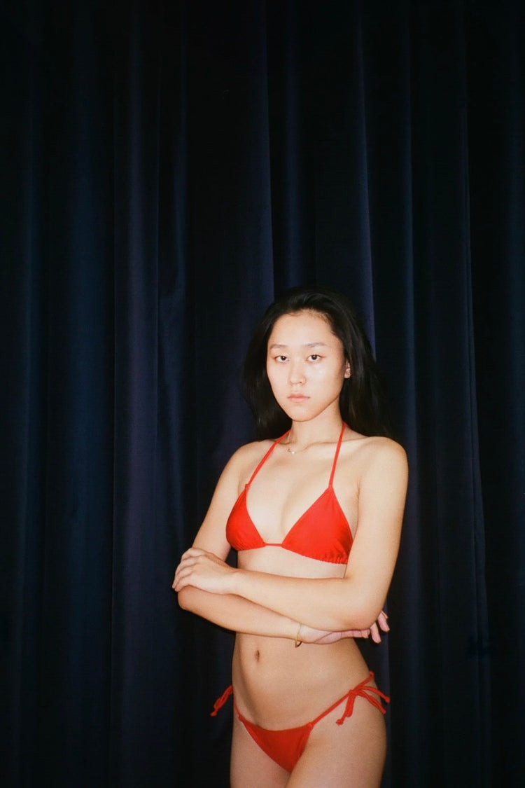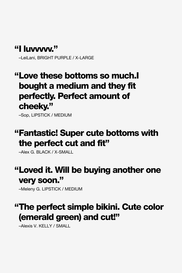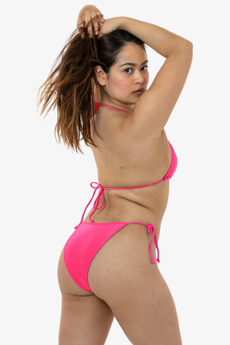 An iconic bikini bottom with spaghetti ties at the sides for an adjustable fit. This bikini bottom has a higher rise than similar styles and a more narrow appearance. We like this style tied above the hips for a 90s inspired look. Try these bottoms with our RNT3003 String Bikini Top or mix and match with our other swim