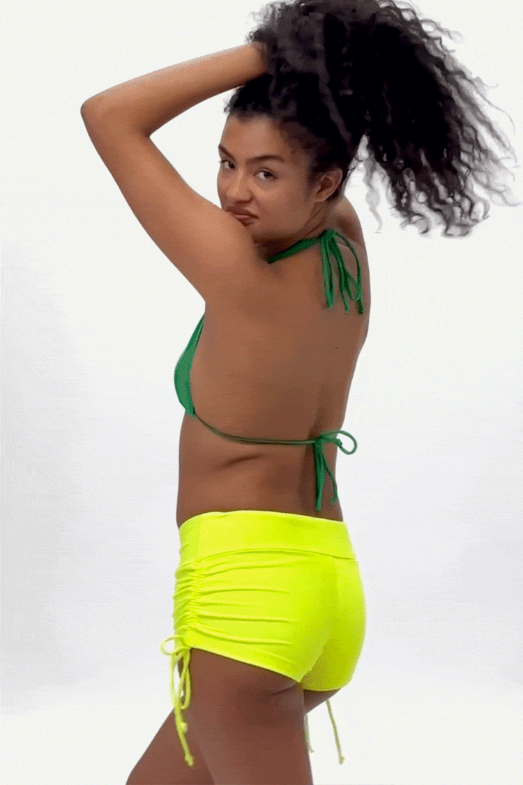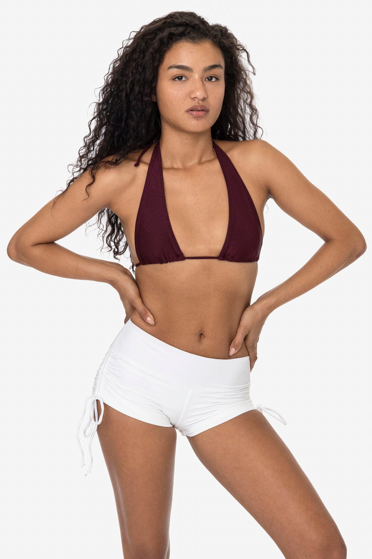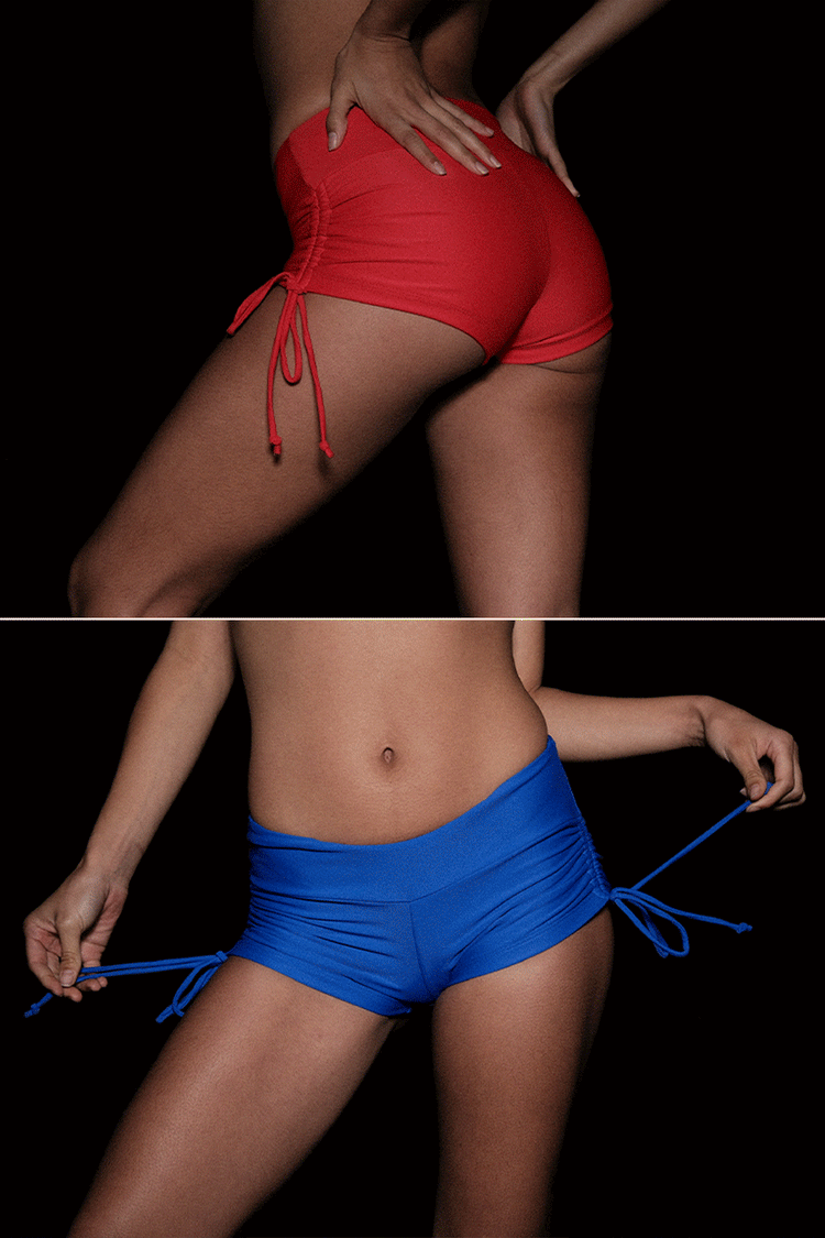 This ruched shorts feature spaghetti ties that allow you to scrunch the sides to your desired length with a low rise fit and thick waistband. These shorts are made of our matte nylon tricot, and are double-layered for full opacity and durability– in or out of the water. Also suitable for the gym, dance and more. Mix a