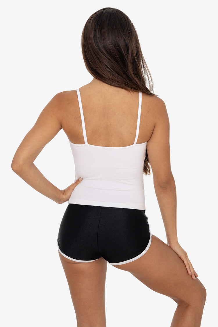 Our classic dolphin running short made from shiny, stretchy nylon tricot. Features an ultra low-rise and cheeky fit. Perfect for the beach, working out, or everyday, casual wear.This style is very stretchy, but we recommend sizing up for larger hips.  Made in Los Angeles, Calif. Our experienced sewers earn up to $25 an