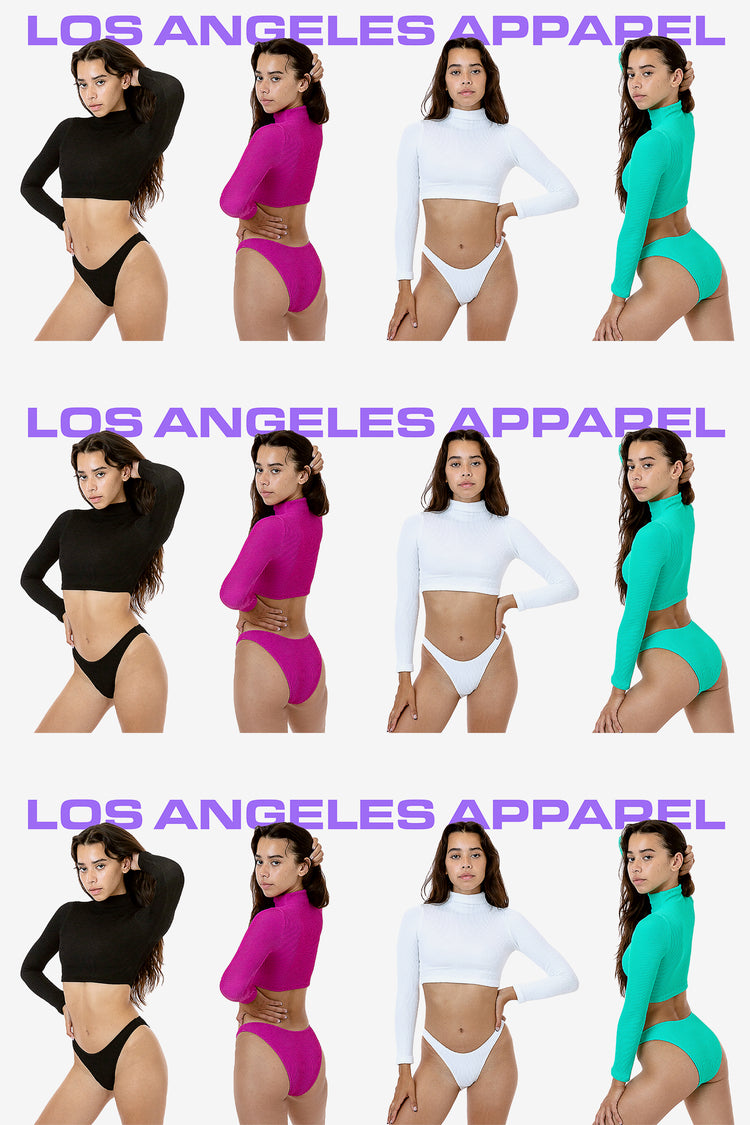 Our crinkle swimwear collection is made of a super stretchy, playfully textured fabric that conforms to fit your body. This statement-making top can be worn on windy days at the beach or with your desired bottoms for everyday wear– like our tennis skirt, jeans or denim shorts. This style features a seamless mockneck,