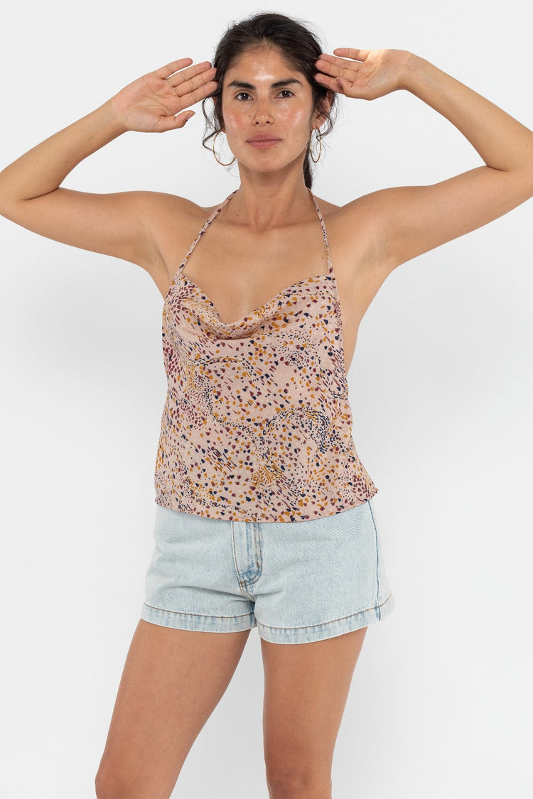 This halter top drapes loosely at the neckline and can be worn high or dangerously low. Great for layering over a swimsuit or worn on its own on sweltering summer nights. Made in Los Angeles, Calif. Our experienced sewers earn up to $25 an hour and no less than $17.87; additionally workers have healthcare benefits for