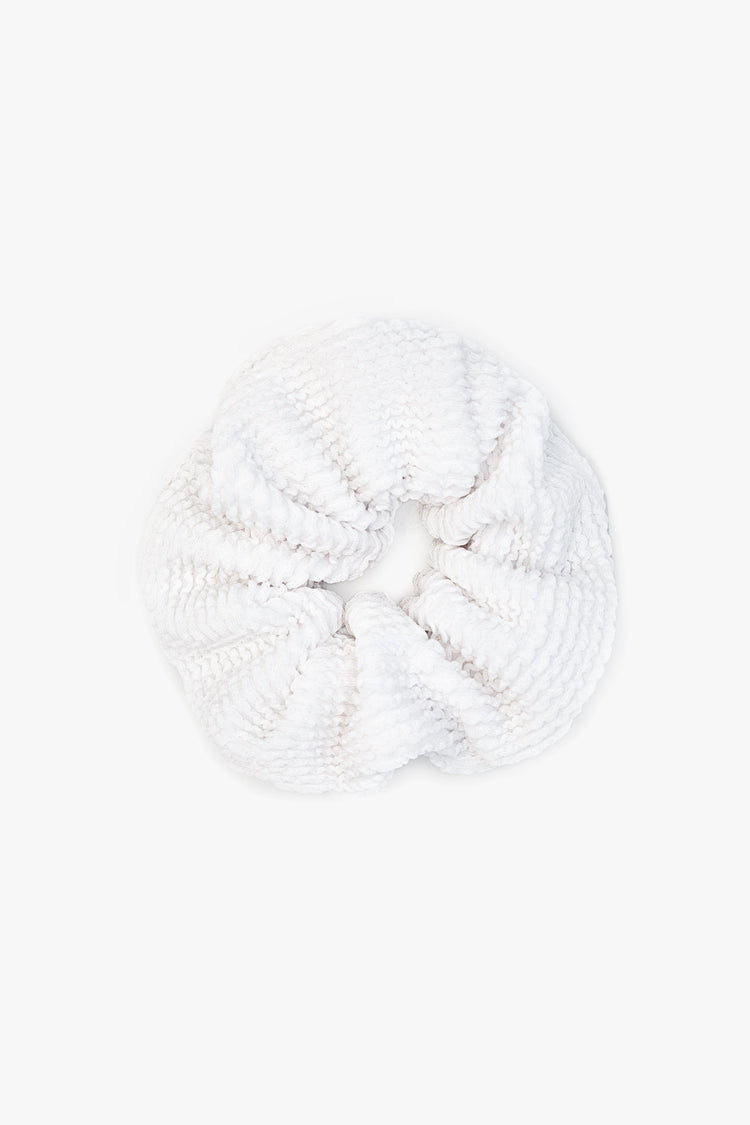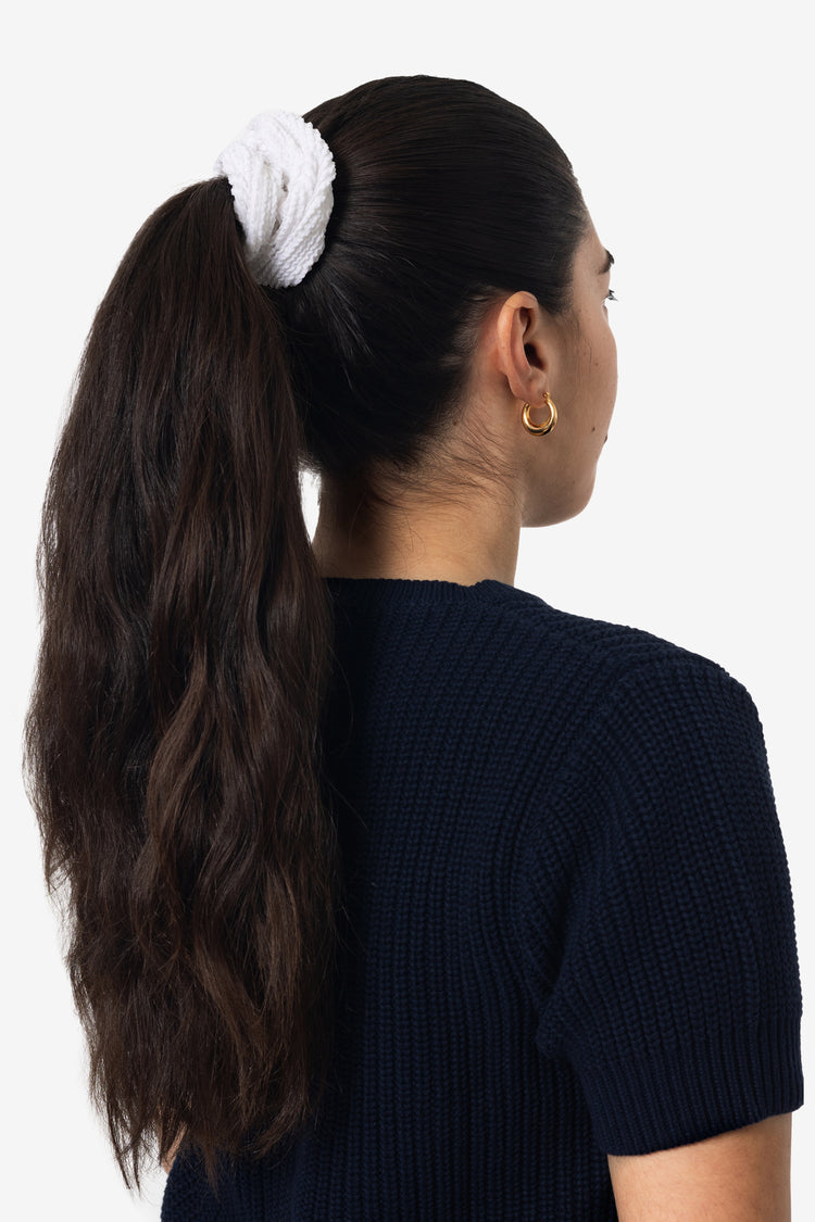 A playful, textured scrunchie to elevate your hairstyles. This classic-sized scrunchie will stay in place without slipping and keep your hair from creasing. Wear with our matching swimsuits. This scrunchie is Made in Los Angeles, Calif. Our experienced sewers earn up to $25 an hour and no less than $17.87; additionally
