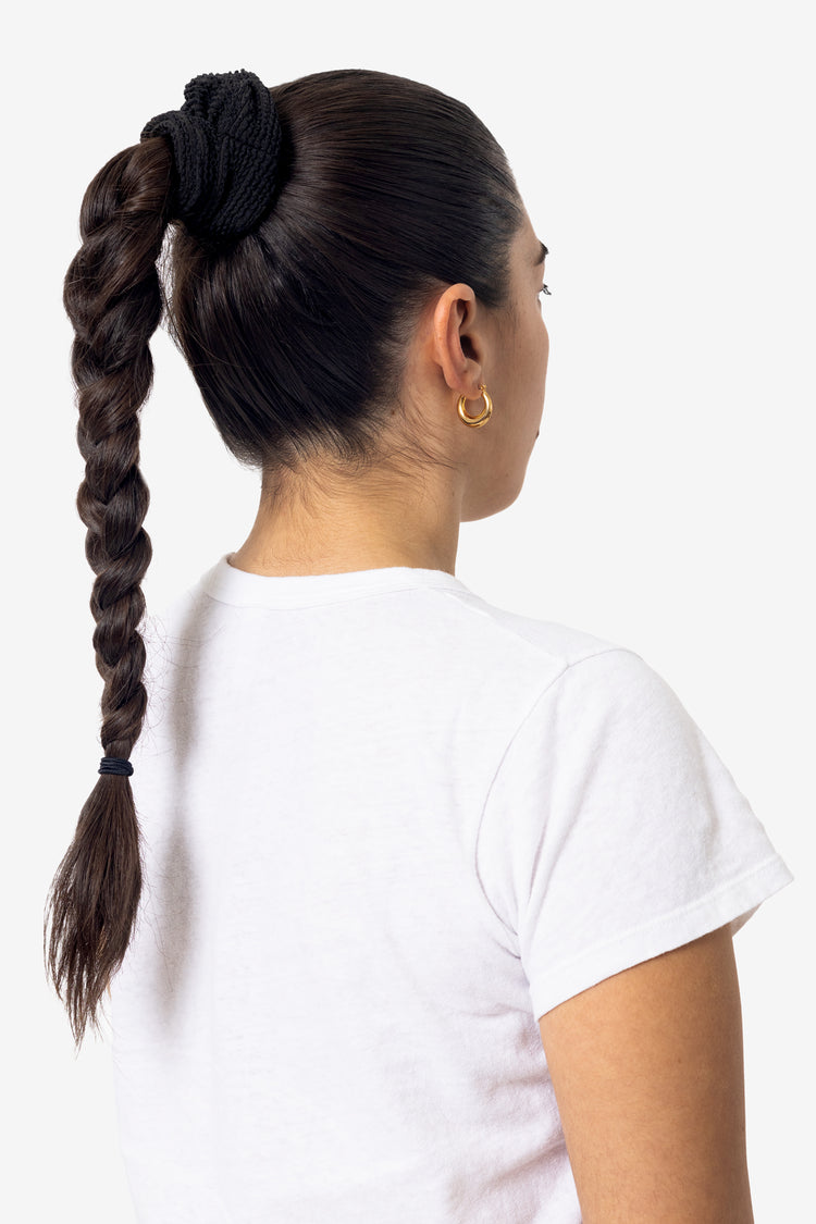 A playful, textured scrunchie to elevate your hairstyles. This classic-sized scrunchie will stay in place without slipping and keep your hair from creasing. Wear with our matching swimsuits. This scrunchie is Made in Los Angeles, Calif. Our experienced sewers earn up to $25 an hour and no less than $17.87; additionally