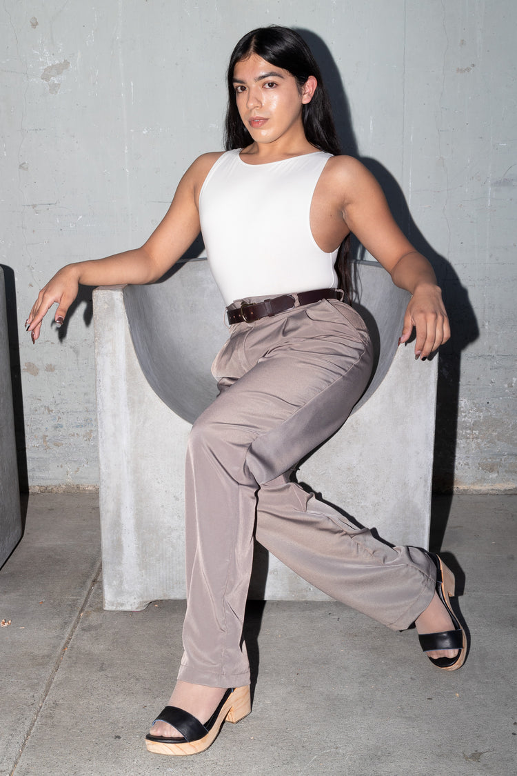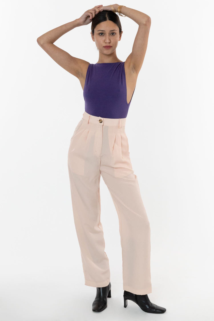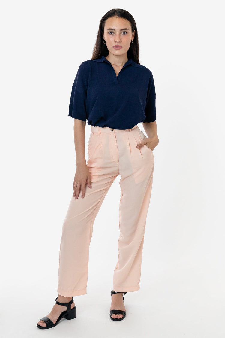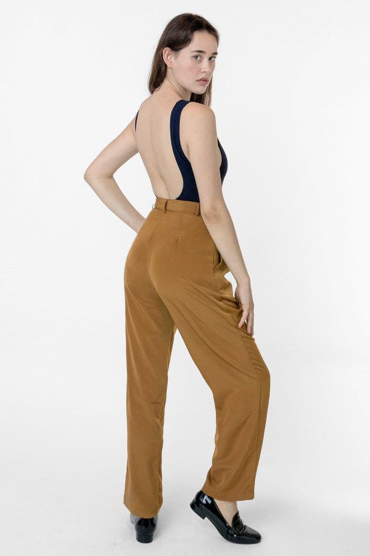 Our updated take on your tailored favorite. The new Poly Pleated Pant features a wider, straight leg with the classic high-waisted fit, front pleats, back darts and 2 side pockets. Made of a lustrous polyester that shines and highlights for an elegant look. The front-zip fly finishes with a tortoise button closure and
