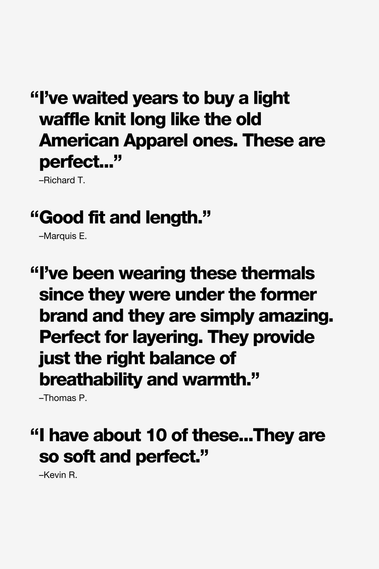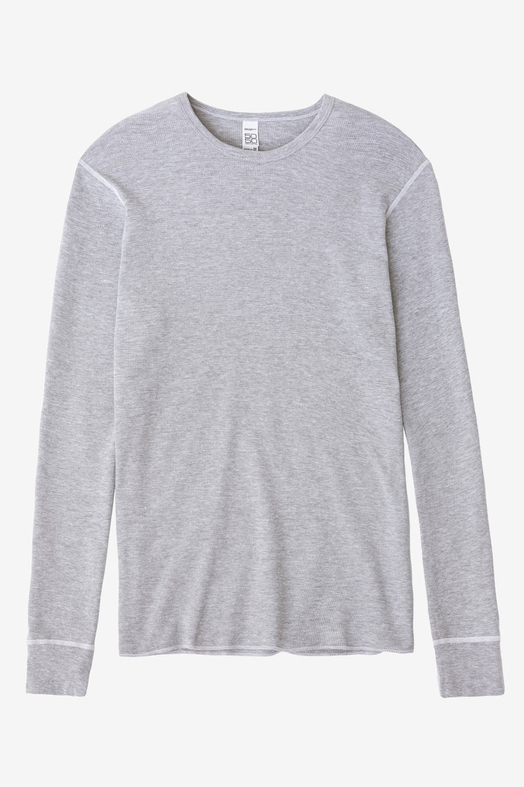 This unisex thermal long sleeve top is made from our 50/50 poly-cotton waffle knit. Features ribbed wrist cuffs and finished with durable flatlock seams. This thermal undershirt is an ideal weight for layering under our heavy fleece sweatshirts for added insulation. We recommend sizing down 1-2 sizes depending on your