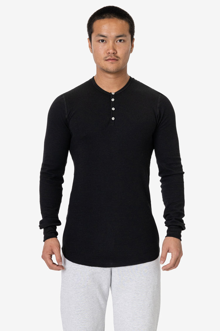 This unisex thermal long sleeve top is made from our 50/50 poly-cotton waffle knit. Features ribbed wrist cuffs and finished with durable flatlock seams and a henley neckline. This thermal undershirt is an ideal weight for layering under our heavy fleece sweatshirts for added insulation. We recommend sizing down 1-2 si