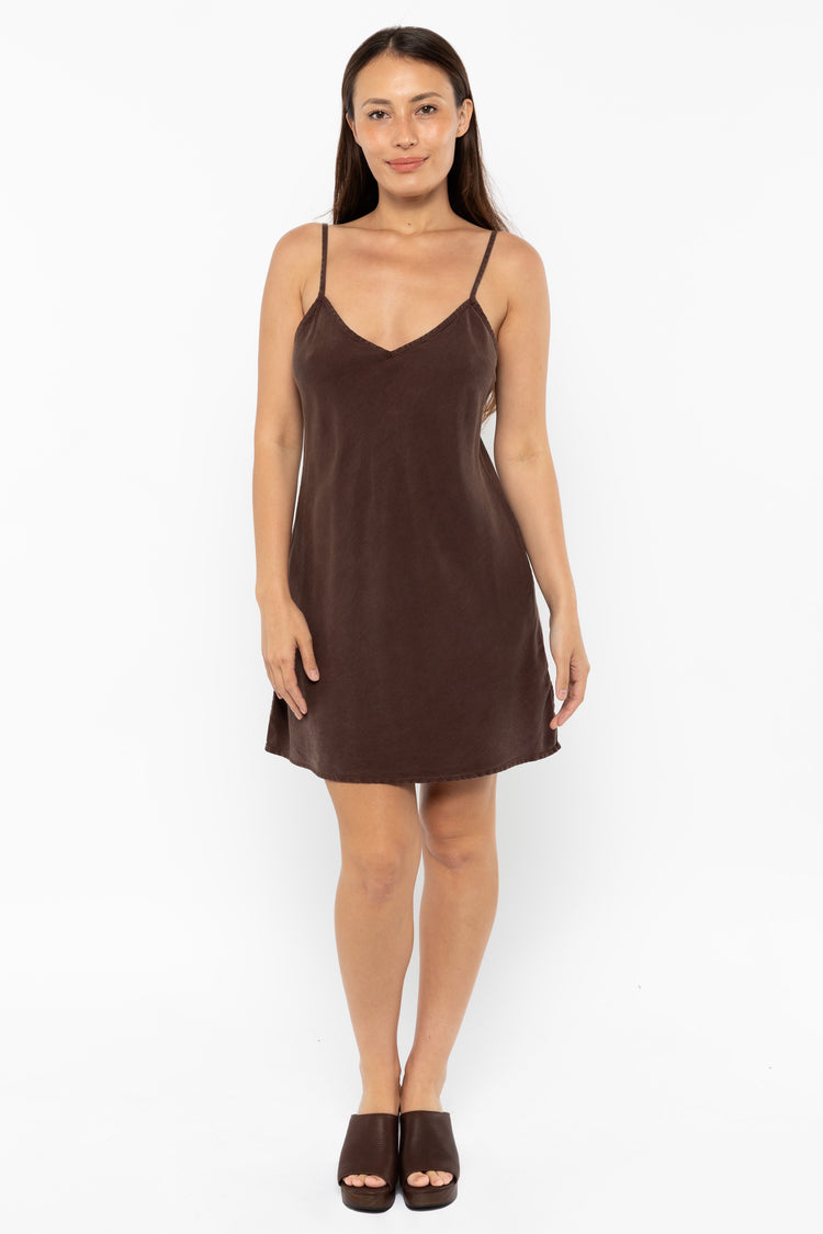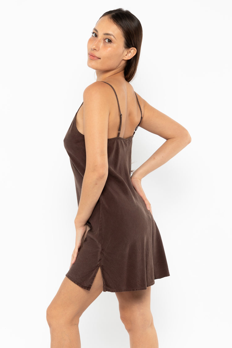 A lightweight mini slip dress with a breezy fit that can be worn from day to night– or to bed. This dress has adjustable spaghetti straps and tasteful slits at the sides. Made from a luxurious 4 oz. woven Tencel that gives a lustrous, drapey look and garment dyed for a clean finish. This style has a generous fit, size