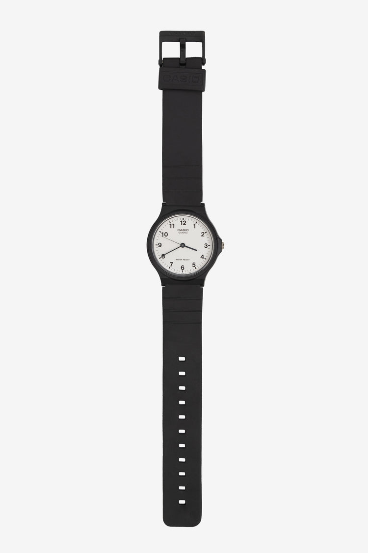 The basic black-and-white design of the Casio Men's Analog Watch makes it a simple, versatile timepiece great for everyday wear. The watch is constructed with a resin case, a black stationary resin bezel, and a black resin link bracelet with an adjustable buckle clasp. A durable mineral window protects the white dial f