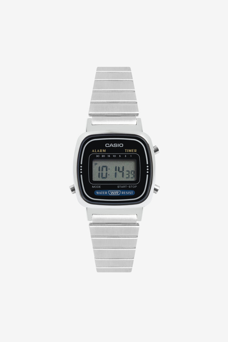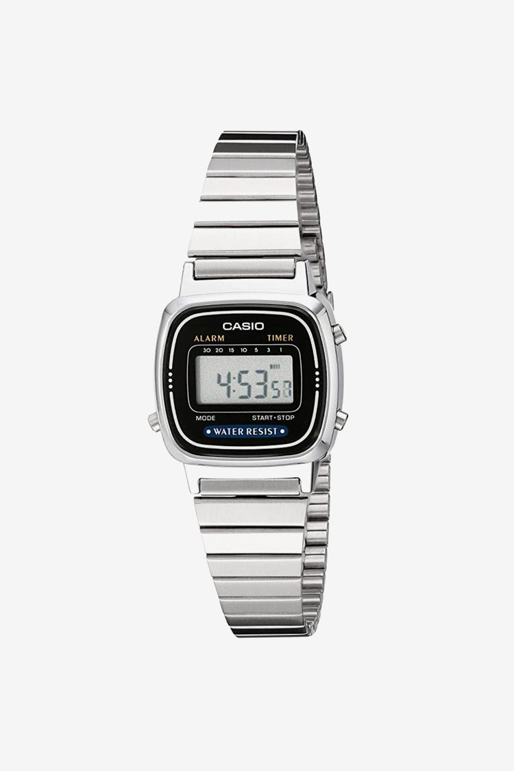 This rare Casio watch is the epitome of vintage cool. The face features a quartz movement with digital-gray dial display and a stainless steel bracelet with fold-over clasp. Water resistant with stopwatch, count-down timer, and perpetual-calendar functions. These watches feature replaceable batteries, which can be conv