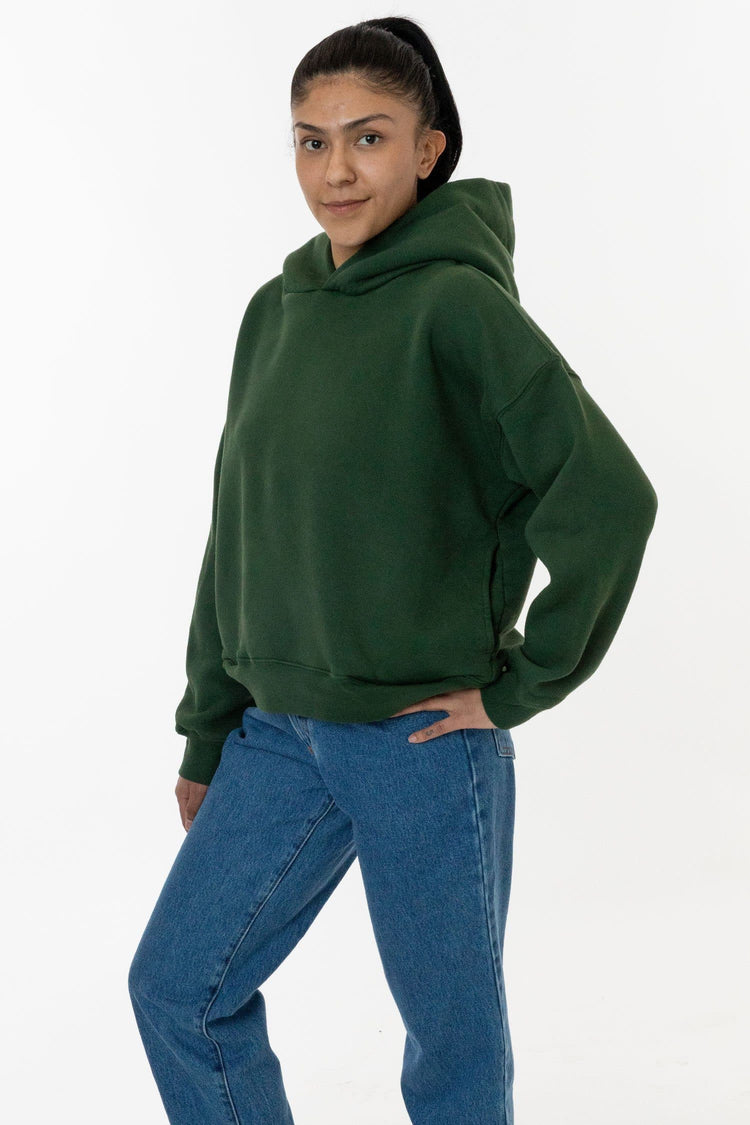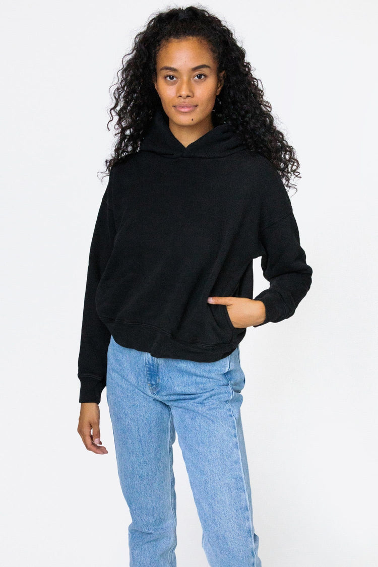 A boxy, cropped hoodie made of a softer, puffy fleece compared our 14 oz. Heavy Fleece. This fleece is made of a combed cotton and has a bouncy, fluffy feel. Features 2 side pockets on the side seam and an oversized fit, and is an optimal winter weight. Try different sizes for different looks. This fleece is very heavy