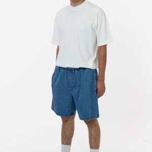 The Baggy Denim Shorts have a vintage look and feel made of 10 oz. 100% Cotton denim. These shorts feature an oversized fit with an elastic drawcord waist, side pockets and back welt pockets. Our experienced sewers earn up to $25 an hour and no less than $17.87; additionally workers have healthcare benefits for less…