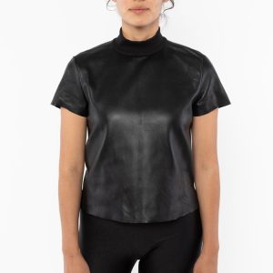 Our Leather Mockneck Tee has a flattering raised mock neck, side slits, and a keyhole button closure. This style is timeless and unexpected. Made from buttery-soft lambskin that is known for being a light-weight all-season leather with natural stretch. Made in Los Angeles, Calif. Our experienced sewers earn up to $25 a